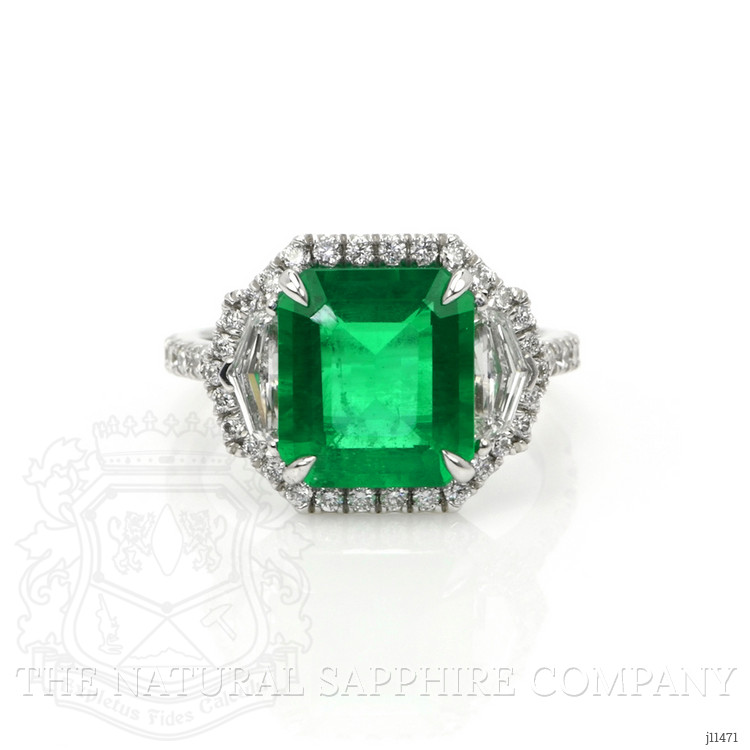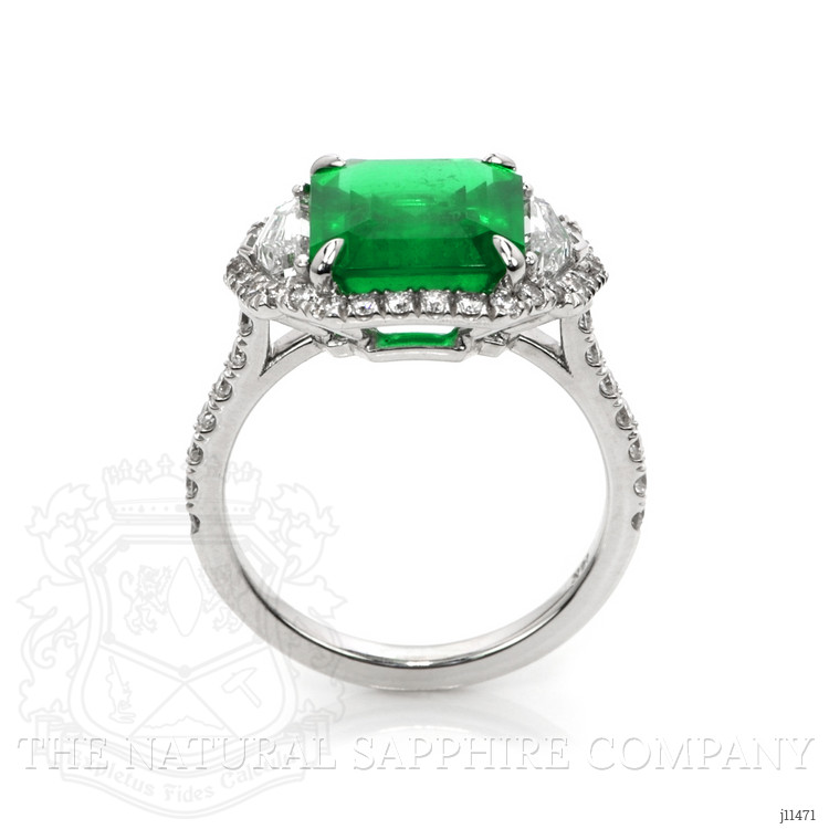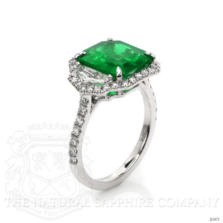 From the moment light meets the heart of this ring, you feel it, a sudden lift of joy as the central emerald breathes with life, a meticulously shaped square cut that dances with every movement, each facet carved to capture and return light in bold, luminous flashes. The cut combines a generous crown and precisely angled pavilion facets, creating a harmonious corridor for light to travel down and rebound up, amplifying the gemstone color while producing lively scintillation. You will notice crisp reflections along the table and step like flashes near the corners, a play of brilliance that makes the green glow deeper, richer, alive. Surrounding the center stone, a halo of micro pavé diamonds catches and disperses light back into the emerald, magnifying its presence and creating a halo of fire that feels like a private sunrise every time the hand moves. The secure four prong setting lifts the gem just enough to allow light to flood from beneath, while the 18K white gold mounting acts as a mirror, reinforcing brightness and contrast, so the emerald appears both vivid and weighty, full of complex green tones that draw the eye and ignite the heart.