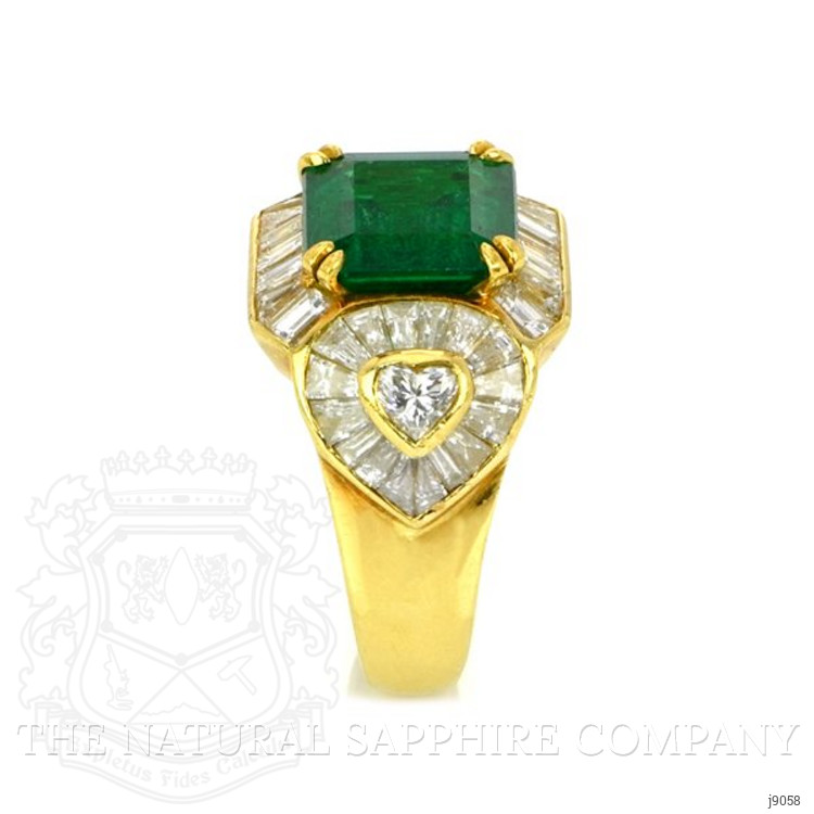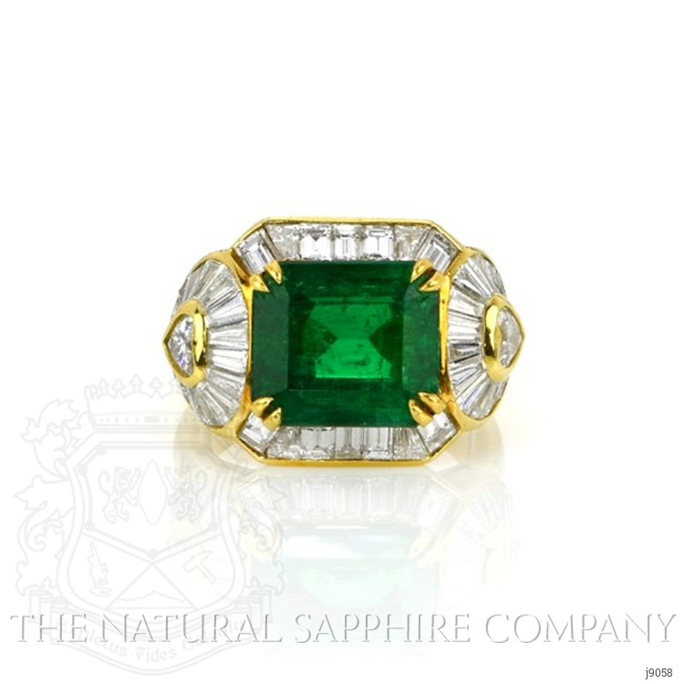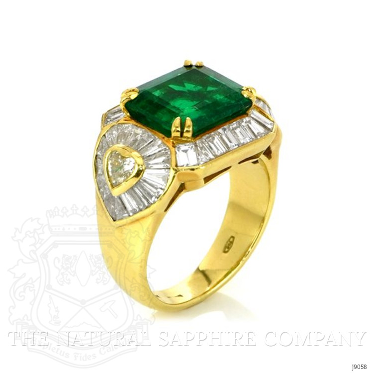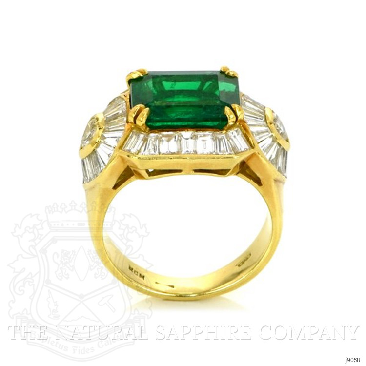The ring primarily features a beautiful, transparent AGL certified 3.65 carat emerald cut shape green emerald with the dimensions of 10.00 x 8.85 x 5.12 mm and is emerald cut. It has a clarity grade of very slightly included (evaluated at eye level), vivid color intensity, and an excellent polish. The origin of this emerald is Afghanistan. Also featured in the ring are 47 white various shaped step cut natural diamonds, weighing a total of 6.58 carats. The natural diamonds have a clarity grade of vvs1 - Very Very Slightly Included., F color The ring is entirely set in 18K yellow gold.