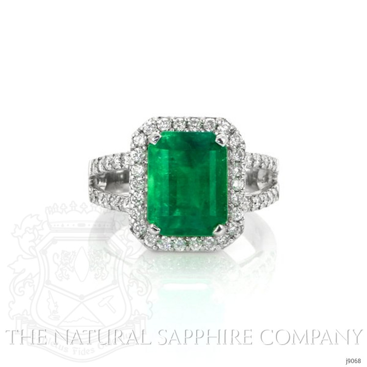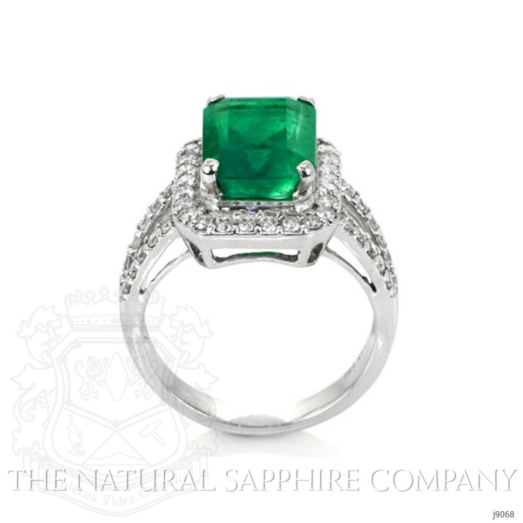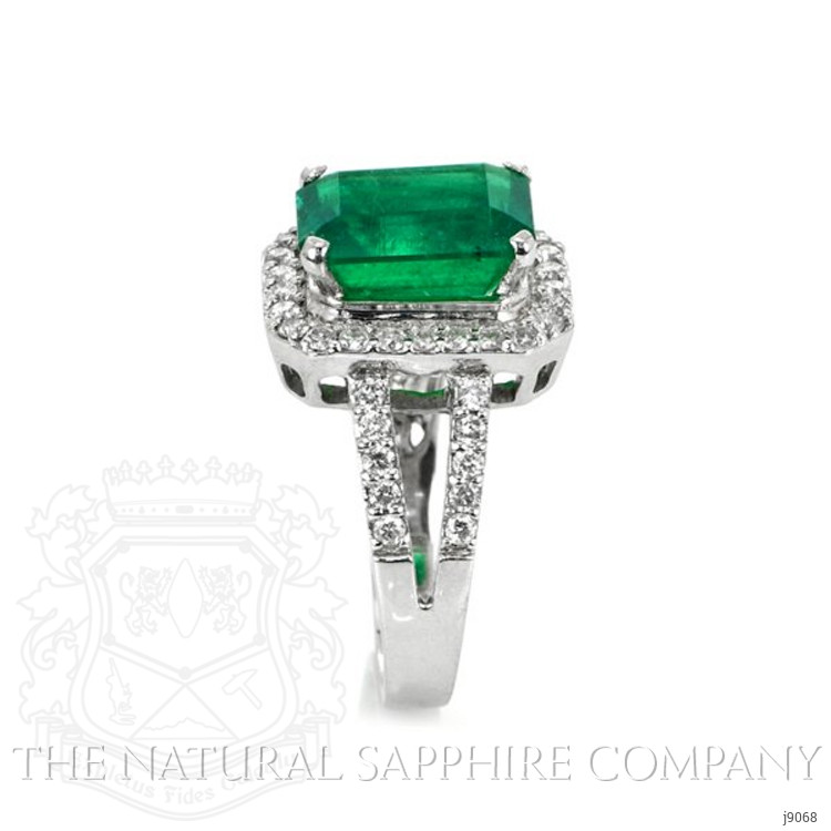 The ring primarily features a beautiful, transparent 3.87 carat emerald cut shape green emerald with the dimensions of 10.74 x 8.25 x 6.58 mm and is emerald cut. It has a clarity grade of very slightly included (evaluated at eye level), intense color intensity, and an excellent polish. The origin of this emerald is Zambia. Also featured in the ring are 46 white round shaped mixed brilliant cut natural diamonds, weighing a total of 0.59 carats. The natural diamonds have a clarity grade of vvs1 - Very Very Slightly Included., F color The ring is entirely set in 18K white gold.