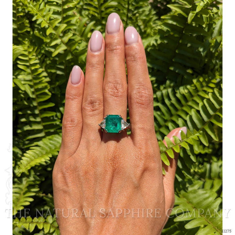 At the heart of this remarkable piece is a captivating emerald, framed by two dazzling diamonds that accentuate its vibrant green hue. The choice of emerald is significant, as it symbolizes renewal and love, making it the perfect gemstone to mark a significant life event such as an engagement, anniversary, or milestone celebration. While many rings on the market feature commonplace sapphires or rubies, the emerald's distinctive color and unique characteristics provide unparalleled beauty and a sense of individuality. Paired with the impeccable craftsmanship of the platinum setting, the combination brings an air of sophistication and exclusivity.