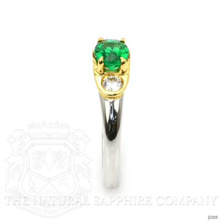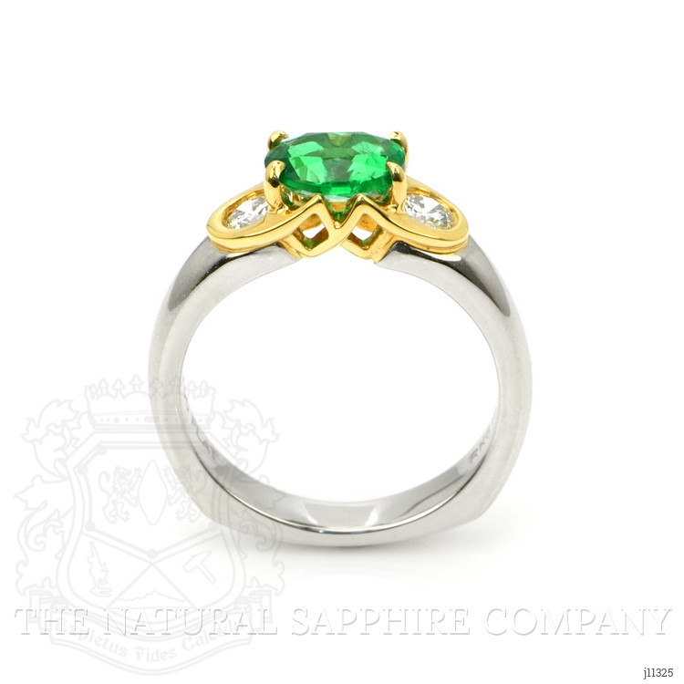 Crafted in gleaming 18K white gold, the band serves as a timeless canvas, drawing the eye to the vibrant centerpiece. The white gold, symbolic of fidelity and prosperity, wraps securely around the finger, a testament to enduring promises and cherished bonds. Its companion, 18K yellow gold, accents the ring with a warm embrace that evokes sunlight filtering through emerald leaves. Together, these metals symbolize the blend of passion and steadfastness, capturing the essence of two souls intertwined.