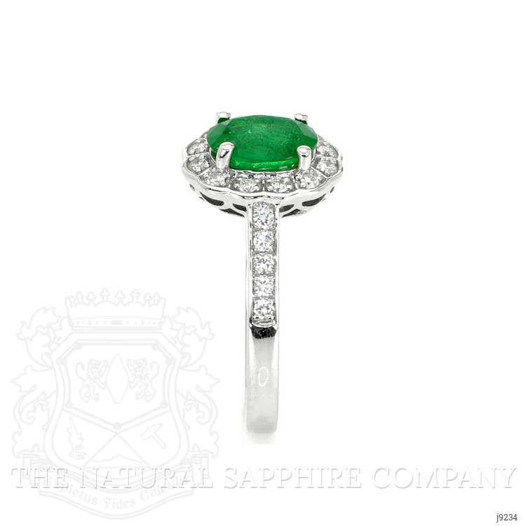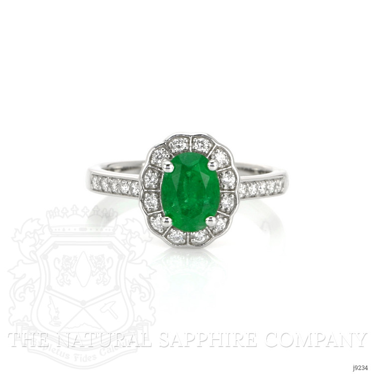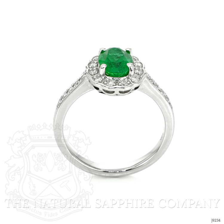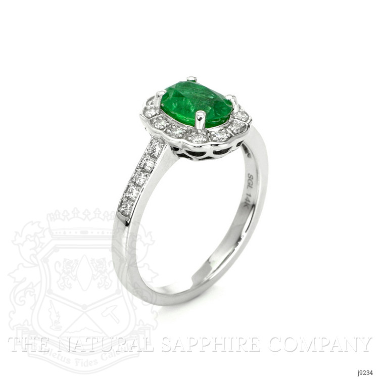 The ring primarily features a beautiful, transparent 1.13 carat oval shape green emerald with the dimensions of 8.00 x 6.00 x 4.00 mm and is brilliant cut. It has a clarity grade of slightly included (evaluated at eye level), vivid color intensity, and an excellent polish. The origin of this emerald is Zambia. Also featured in the ring are 22 white round shaped brilliant cut natural diamonds, weighing a total of 0.23 carats. The natural diamonds have a clarity grade of vs2 - Very Slightly Included, G color, and color saturation of g. The ring is entirely set in 14K white gold.