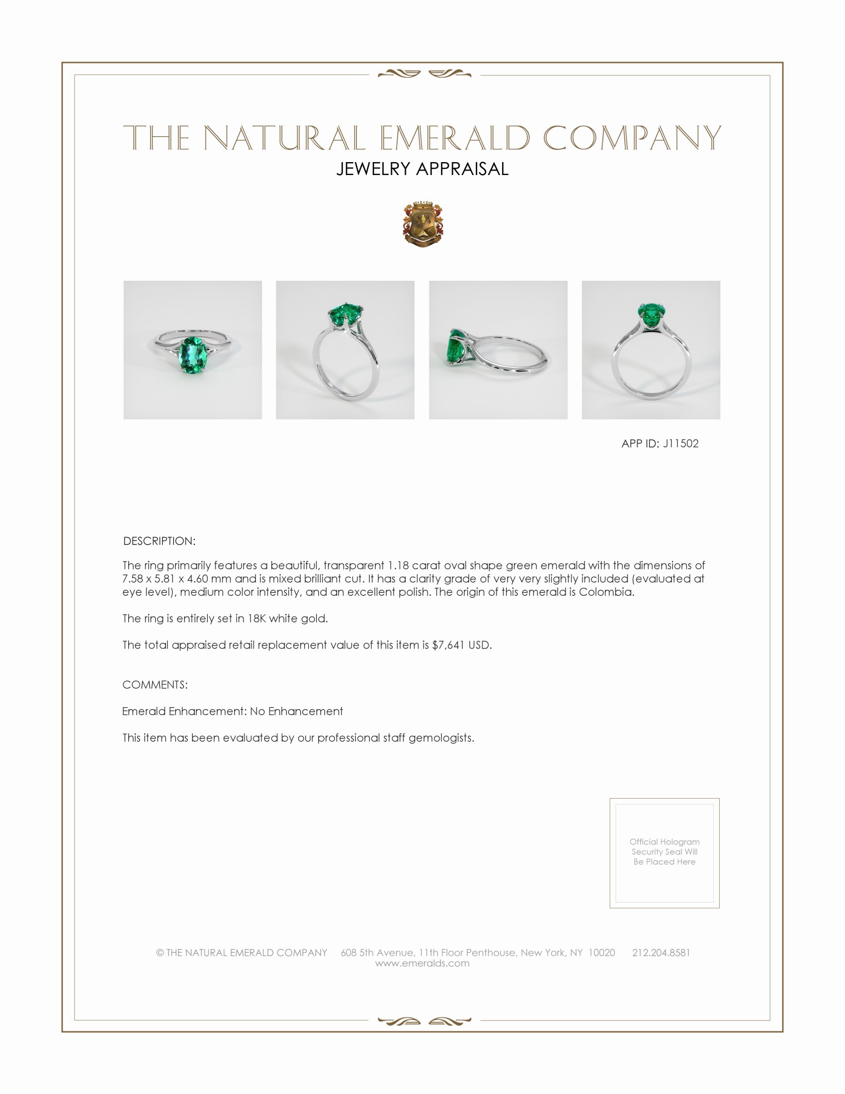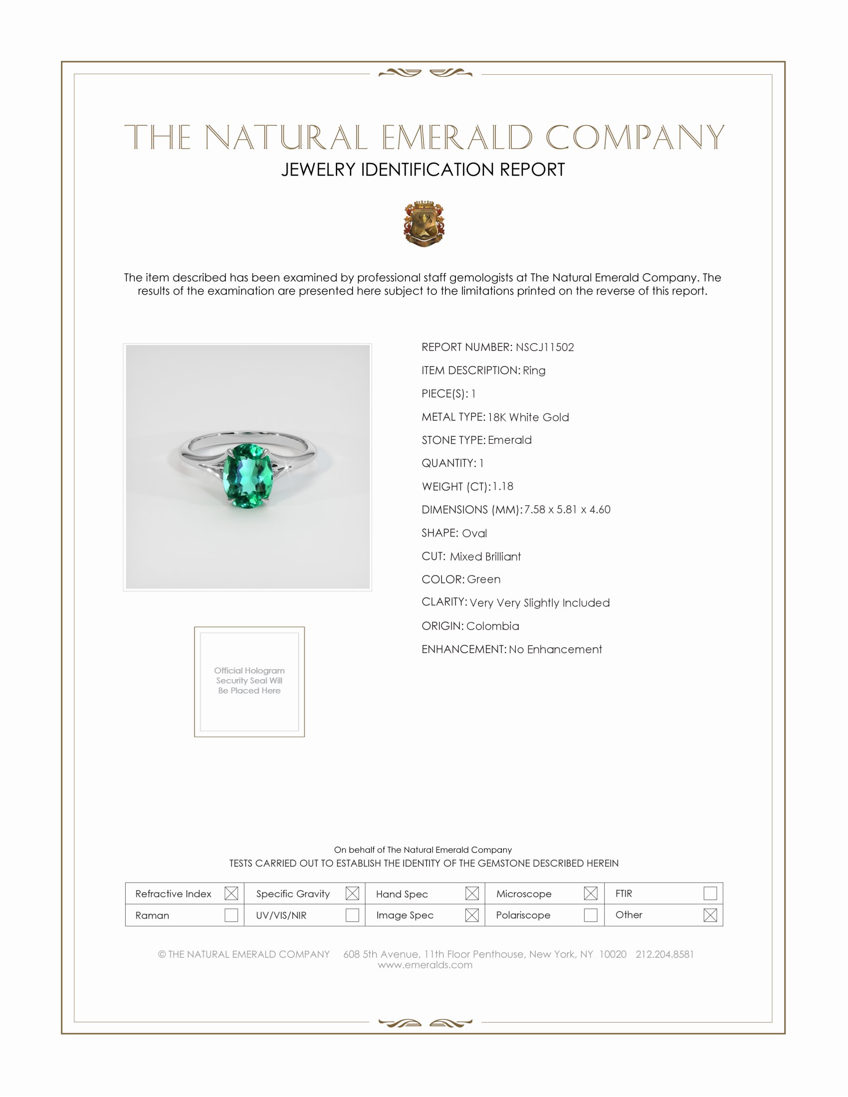1.18 Ct. Emerald Solitaire Ring, 18K White Gold
