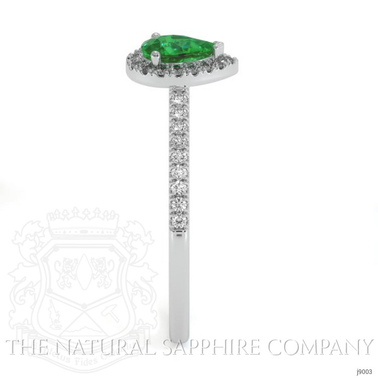 The Emerald's setting in 18K white gold serves to amplify its natural allure. White gold provides a sleek, lustrous frame that accentuates the green of the gemstone, creating a stunning contrast that intensifies both the color and clarity. This choice of metal is more than a mere aesthetic decision; its strength and resilience provide a secure embrace for the gemstone, safeguarding it while offering a surface that brightly reflects light back through the jewel. Such brilliance is not arbitrary but rather the product of deliberate craftsmanship, ensuring that each angle of the pear-shaped Emerald is highlighted, enhancing its naturally vivid green hue.
