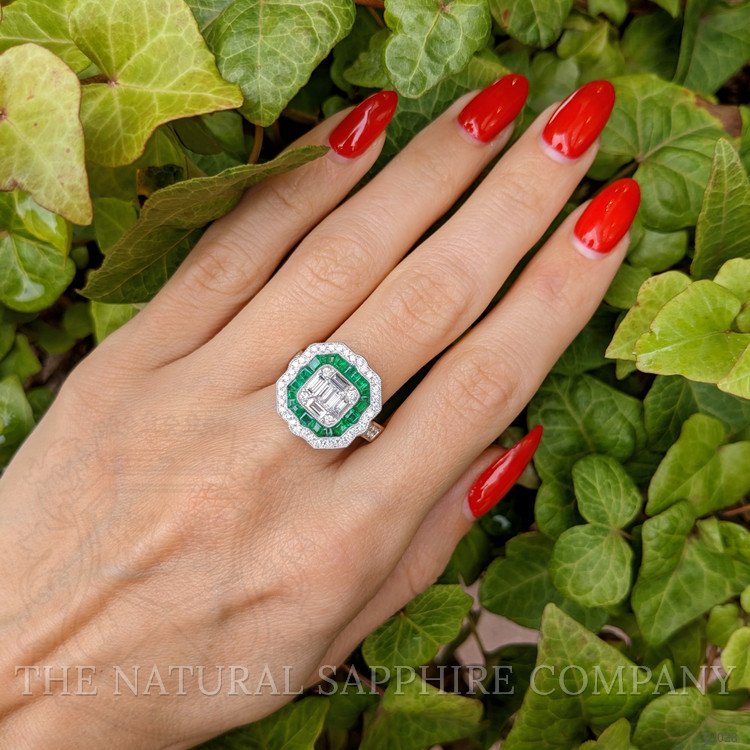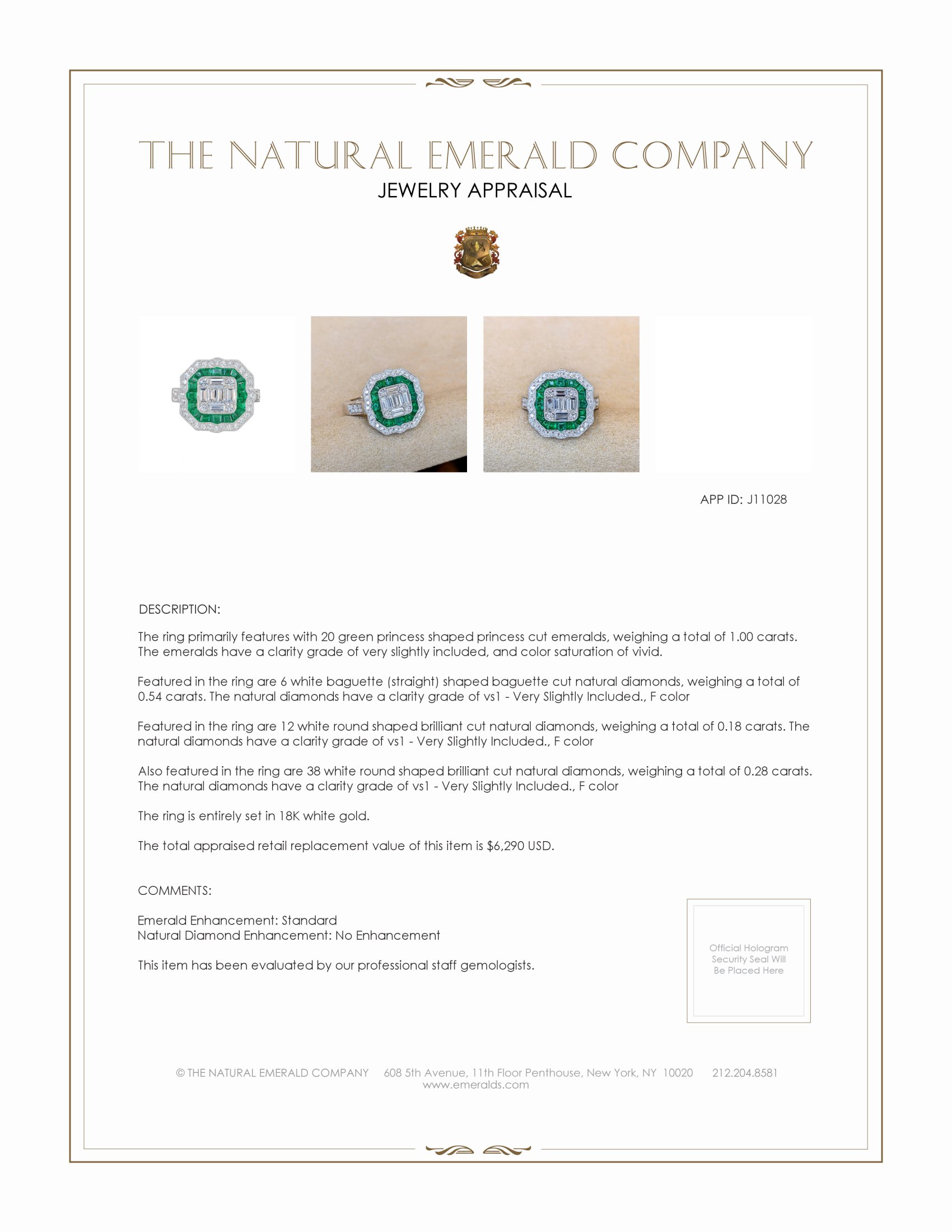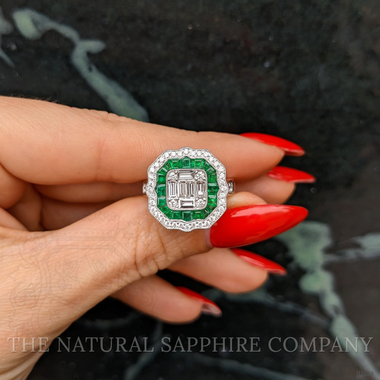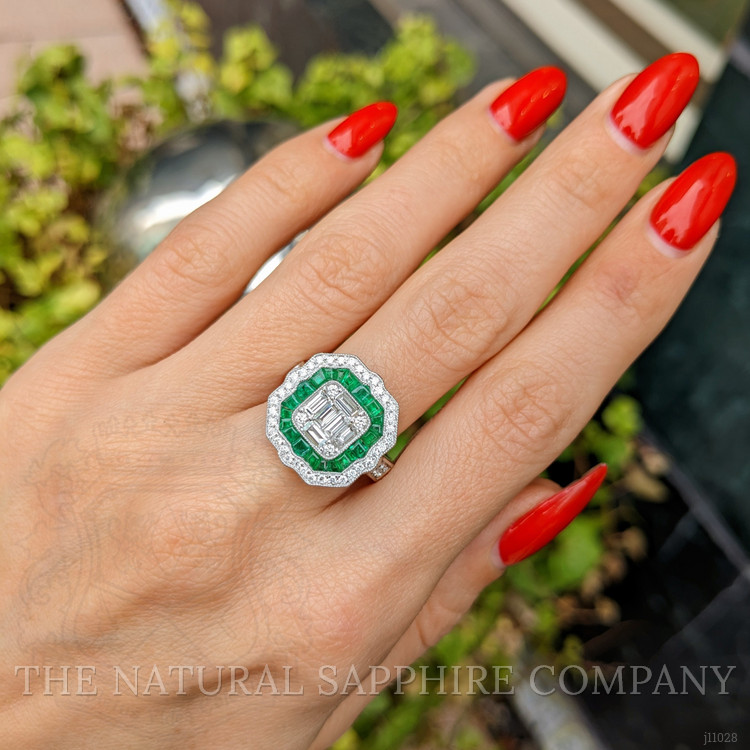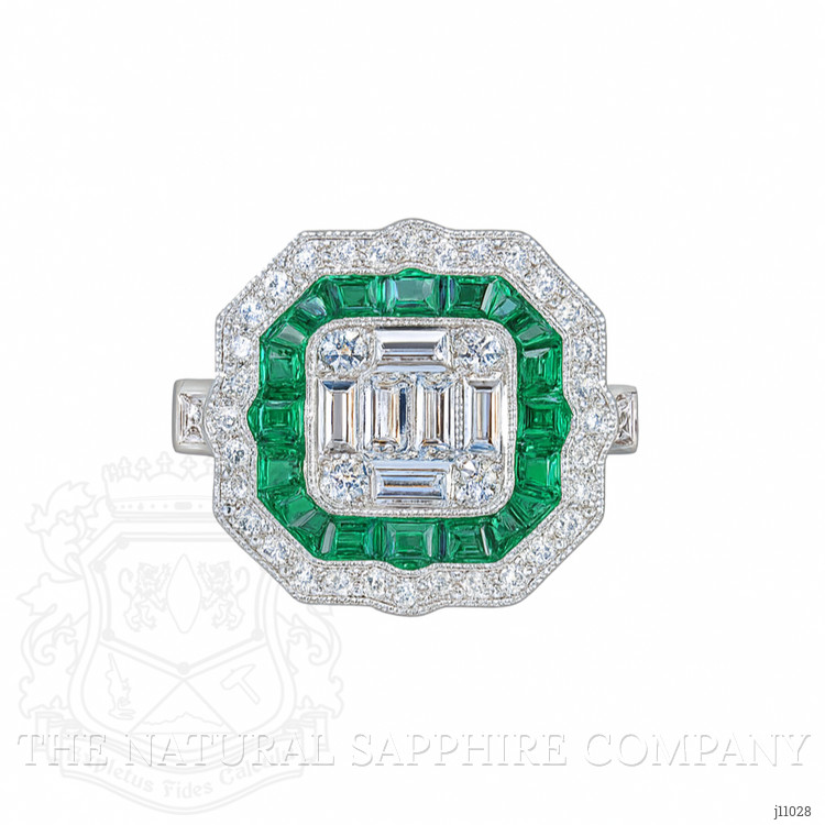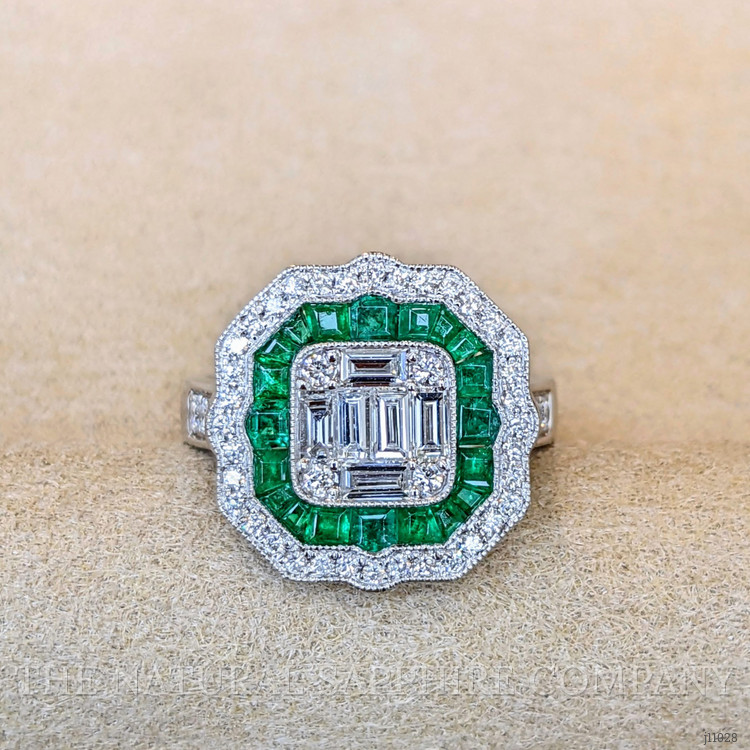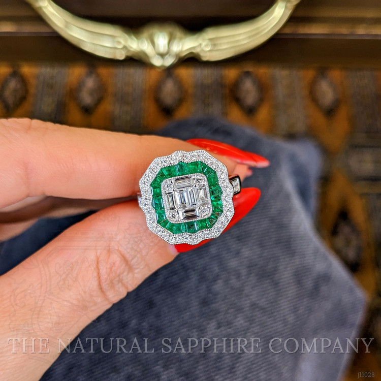 Discover the epitome of timeless elegance and unparalleled craftsmanship with this magnificent ring, a piece that redefines luxury and sophistication for the discerning connoisseur. Crafted entirely from radiant 18K white gold, this ring embodies a fusion of classic charm and modern artistry, creating an heirloom that is as unique as you are. Enveloped in mystery and allure, the central motif features an exquisite array of baguette-cut diamond simulants, perfectly aligned to capture and reflect light from every angle. This centerpiece is gracefully embraced by a vivid constellation of vibrant green stones, adding a touch of nature’s most captivating hues to this exquisite creation.