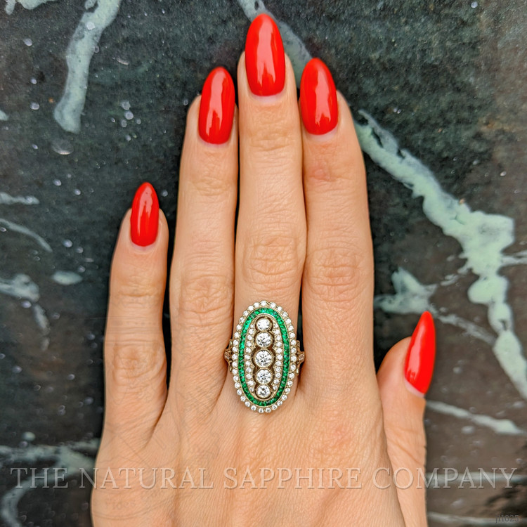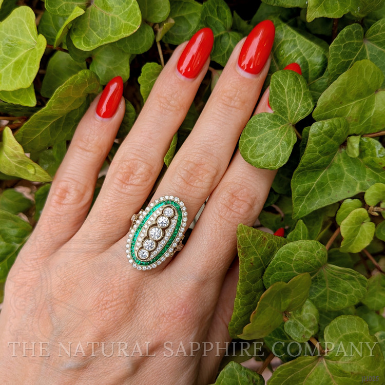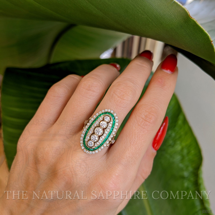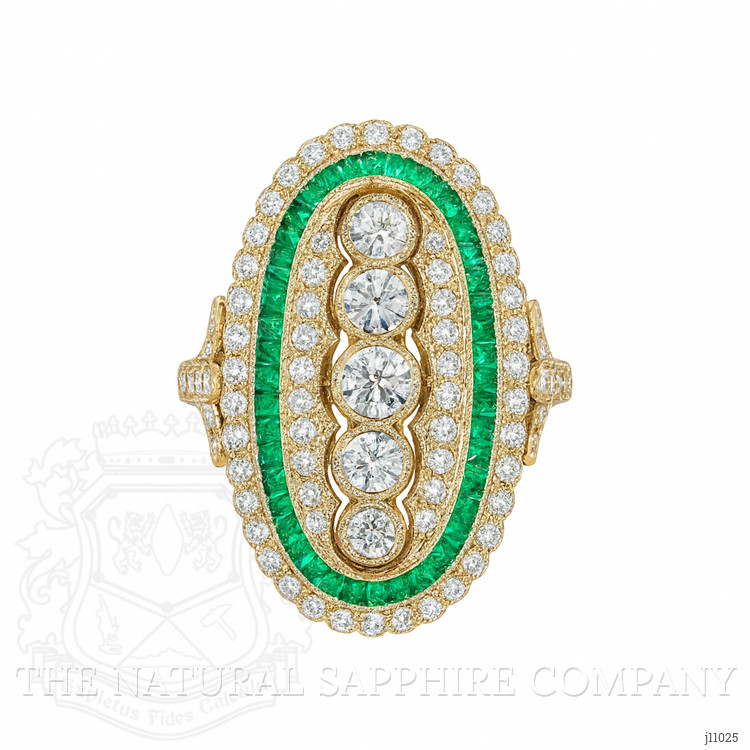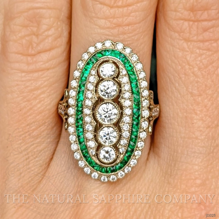 This exquisite ring, crafted entirely in 18K yellow gold, is a remarkable specimen of fine jewelry that attributes its unique allure to a harmonious blend of sophisticated design and precise craftsmanship. Set at the heart of the ring are five meticulously faceted round brilliant-cut diamonds, each flawlessly framed to enhance their scintillating brilliance. These diamonds are carefully chosen for their excellent color grade and clarity, ensuring that every angle catches and reflects light brilliantly, adding a dazzling allure that attracts the eye. Balancing these central stones is a halo of vividly hued green gemstones, expertly set to provide a striking contrast that emphasizes the central diamonds. The green stones undergo a precise faceting process which juxtaposes the stones’ vivid color against the warm gold setting, creating a sense of timeless elegance.