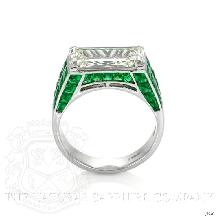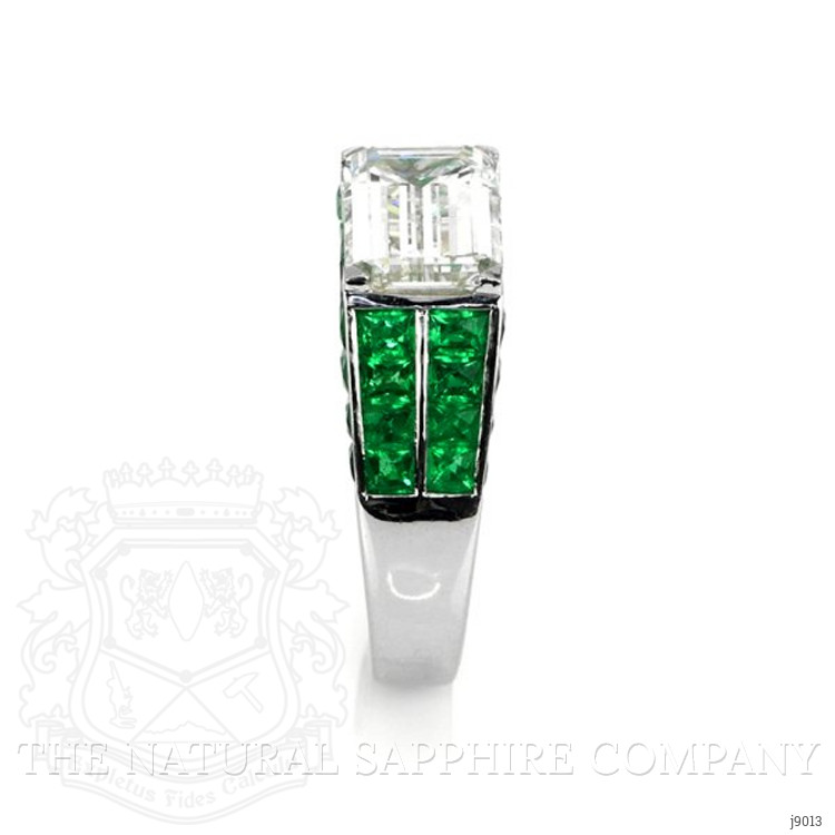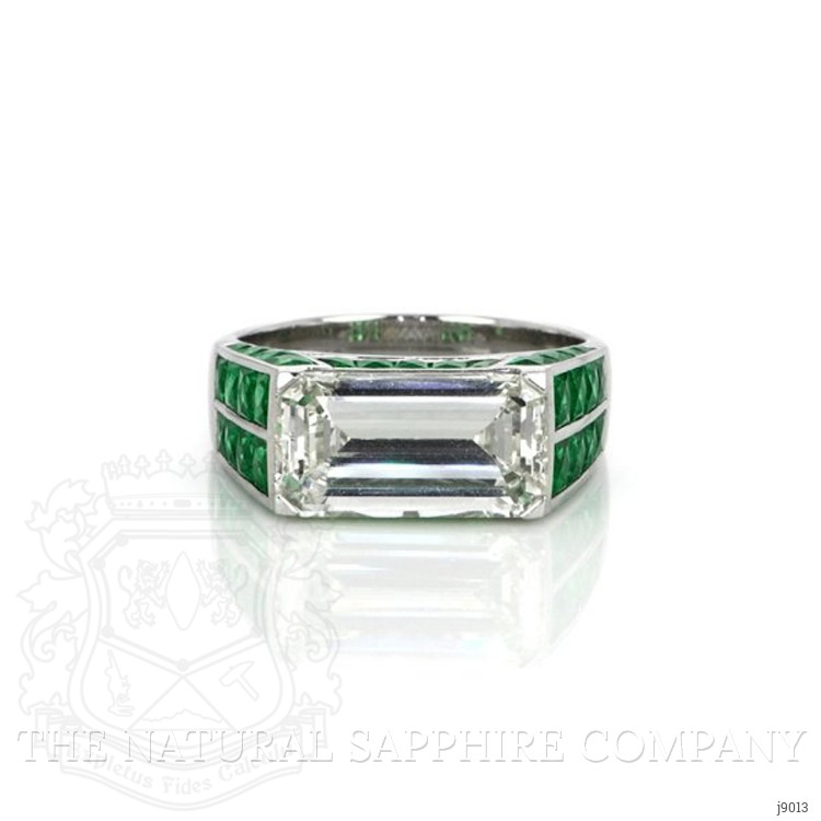 The ring primarily features with 42 green princess shaped princess cut emeralds, weighing a total of 1.50 carats. The emeralds have a clarity grade of very slightly included, and color saturation of vivid. Also featured in the ring are 1 white emerald cut shaped step cut natural diamonds, weighing a total of 3.58 carats. The natural diamonds have a clarity grade of vvs1 - Very Very Slightly Included, G color, and color saturation of g. The ring is entirely set in platinum 950.