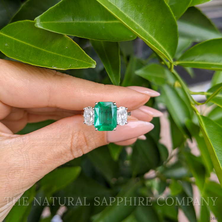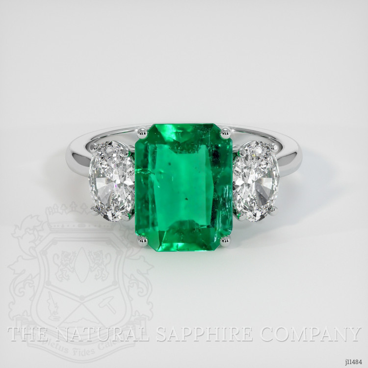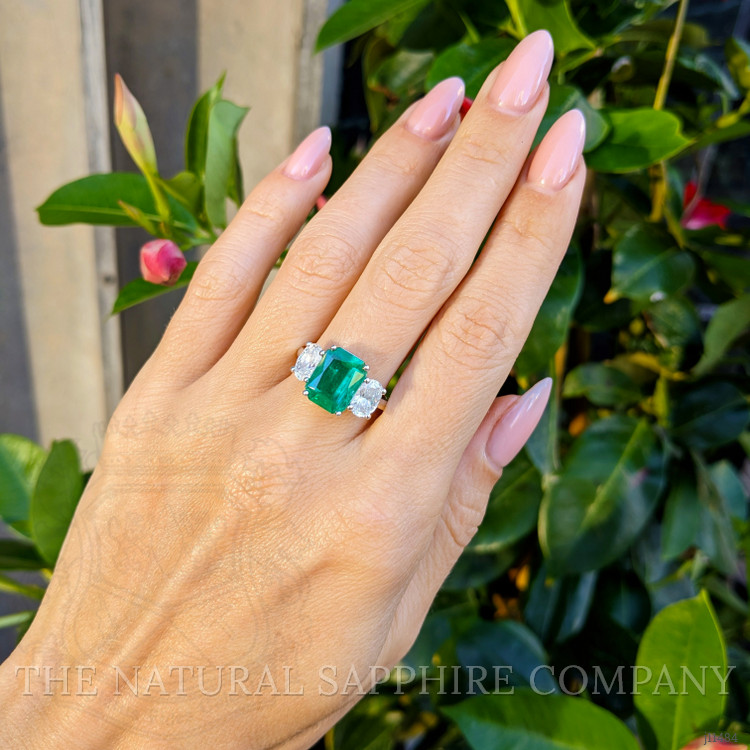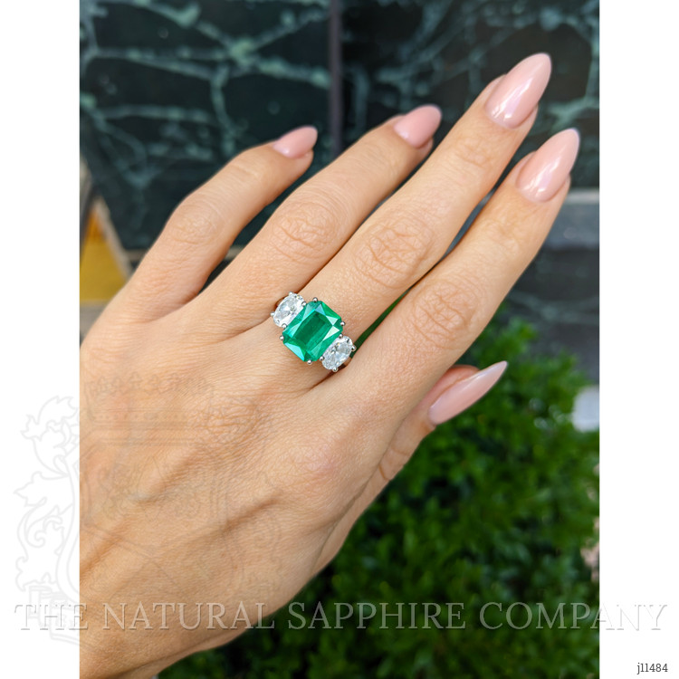 Practical considerations follow directly from the gem properties and the platinum 950 construction, the metal secures the stones without obscuring them, periodic professional inspection of prongs and settings is recommended to preserve security, and routine care should avoid ultrasonic cleaning for the emerald and favor gentle cleaning with mild soap and a soft brush. If desired a laboratory report from a recognized gemological institute can further document clarity, treatments, and origin, providing an exact comparison to graded stones in the market, and supporting informed ownership of a ring that balances exceptional color, considered clarity, and enduring platinum craftsmanship.