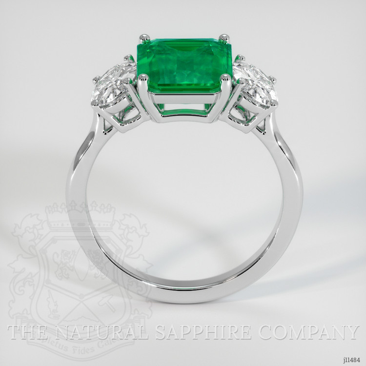 This ring is fully executed in platinum 950, the alloy chosen for its density, wear resistance, and natural white sheen, providing a secure and enduring framework for the gemstones. The central emerald is presented in a classic rectangular, emerald cut, oriented to maximize the gem's color and table transparency, while two substantial brilliant cut diamonds flank the center stone, offering contrast in both luster and light performance. The setting employs four prongs for the center gem and complementary prong work for the side diamonds, the arrangement allowing controlled light entry and easing routine inspection of the pavilion and girdle regions. The combination of vivid green in the center and high brilliance in the side diamonds is underscored by the platinum 950 metal, which maintains its tone and resists deformation over time.