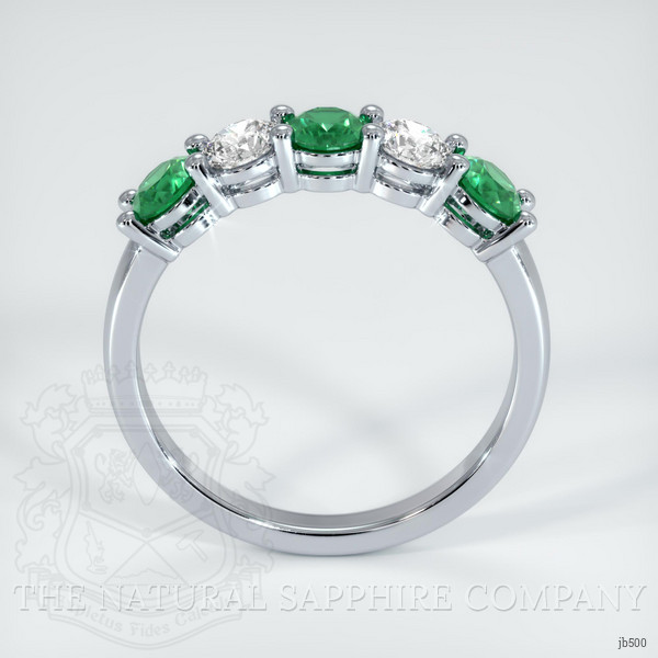 Introducing our exquisite prong-style gemstone band ring, crafted with a high-polish finish that exudes elegance and sophistication. This carefully designed piece is a blend of classic and contemporary, perfect for the discerning female clientele who appreciates fine jewelry. At the heart of this striking piece are beautifully set round cut diamonds and emeralds, each selected for their exceptional quality and brilliance. The round shape allows the side stones to capture and reflect light brilliantly, creating a stunning effect that catches the eye. The white diamonds contrast magnificently with the lush green emeralds, offering a vibrant yet balanced color palette.