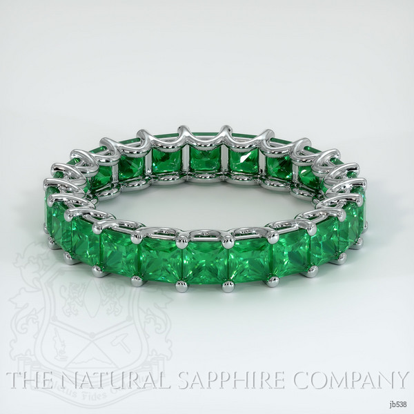 The use of princess-cut stones in this eternity band is a masterstroke, marrying the elegance of emeralds with the modernity of their geometric shape. The clean lines of the princess cut enhance the natural allure of the emeralds, showcasing their breathtaking color and clarity. Set in a continuous loop, these stones symbolize eternal love and commitment, making this band a quintessential choice for those looking to make a lifelong statement. The high polish of the band itself provides an exquisite contrast with the green hues of the emeralds, creating a visual interplay that grabs attention and admiration.