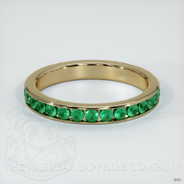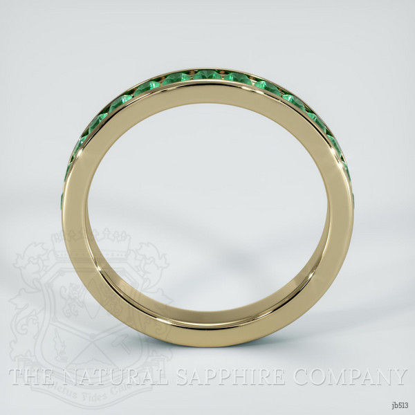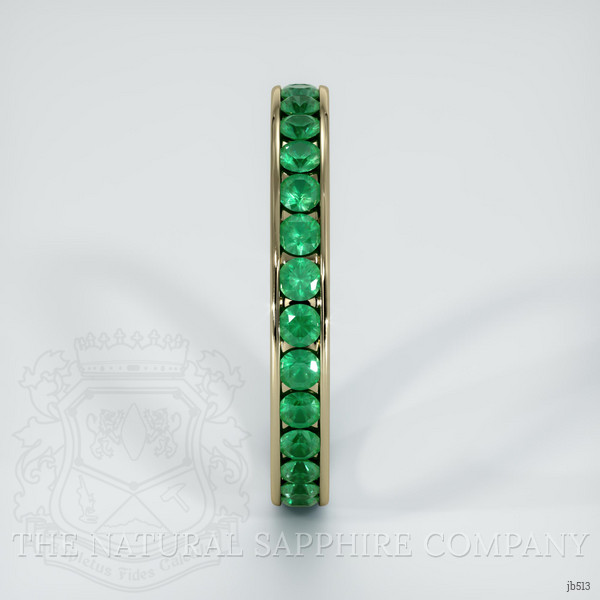 The crown jewels of this radiant piece are the round, green emeralds, nestled gracefully in a channel setting. Each emerald, a treasure of nature, is as captivating as an untouched forest glade, whispering secrets of ancient love stories and promises yet to bloom. The green of the stones mesmerizes, like the first hints of spring’s tiniest buds breaking free from winter’s embrace. These gems invite you to glimpse the vibrant embrace of nature captured in a moment, with each stone polished to perfection, reflecting a love as vibrant and enduring as the eternal twilight.