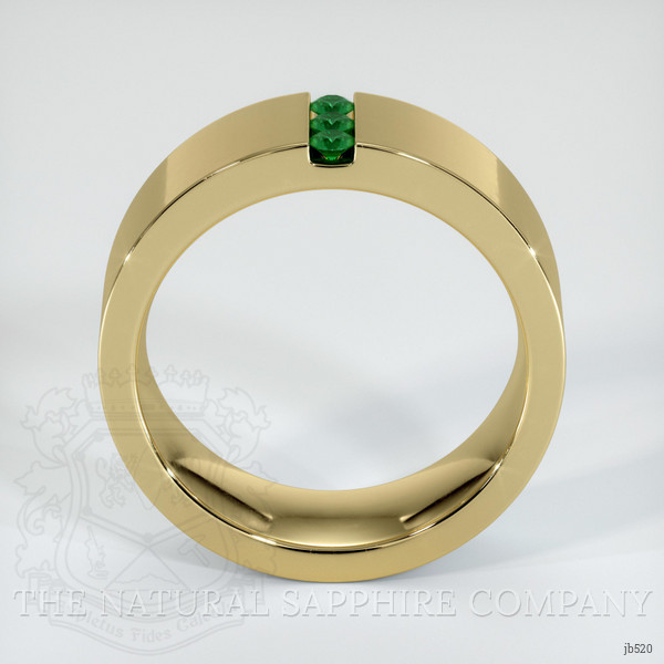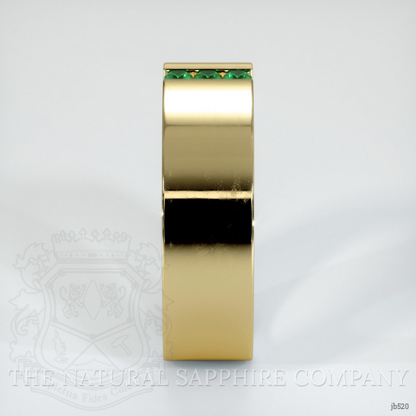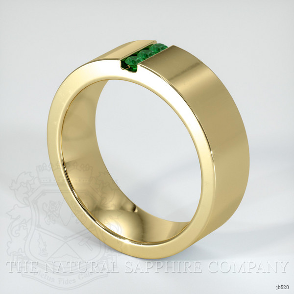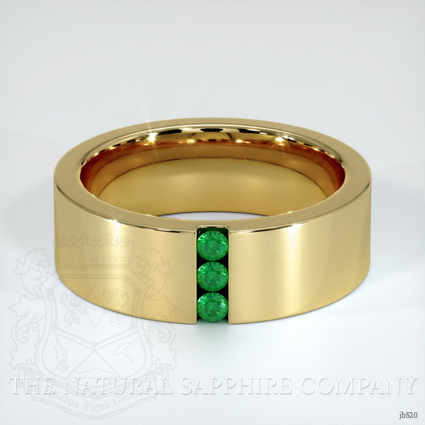 What sets this band apart are the exquisite round emerald side stones that are expertly channel-set into the band. The emeralds are a vibrant green, known for their captivating hue and historical symbolism of harmony and love. With a history that traces back to the ancient royals, emeralds have been celebrated for millennia. These gemstones are carefully selected for their clarity and quality, ensuring that each stone accentuates the timeless elegance of the band. The channel setting not only secures the gems in place but also allows for maximum light reflection, enhancing the natural brilliance of each emerald. The precision in the setting technique upholds the sleek and modern aesthetic of the piece, making it perfectly suited for anyone valuing understated luxury.