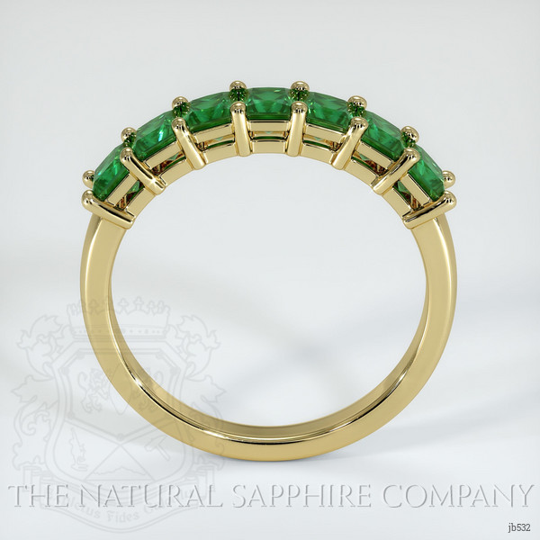 The band is intelligently structured to feature a Prong style setting, which not only secures the stones in place but also allows maximum light exposure to each gemstone. This enhances the natural brilliance and rich hue of the emeralds. Each stone is expertly cut into the distinctive Princess shape, offering a modern and striking edge to the traditional emerald setting. Emerald, being the Side Stone Type, showcases a vivid green color that is treasured for its classic association with opulence and luxury. The Side Stone Color, a deep, lush green, is both captivating and versatile.