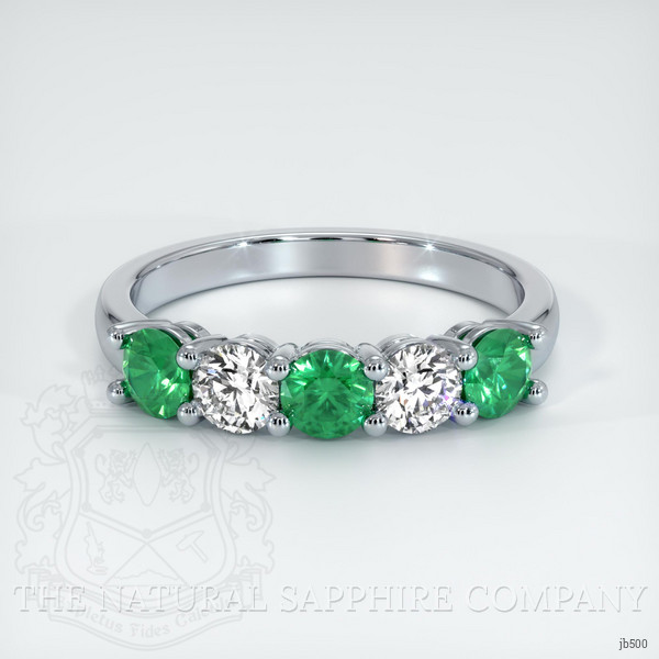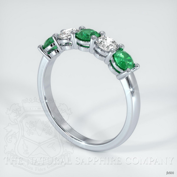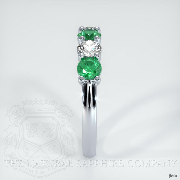 Introducing our exquisite prong-style gemstone band ring, crafted with a high-polish finish that exudes elegance and sophistication. This carefully designed piece is a blend of classic and contemporary, perfect for the discerning female clientele who appreciates fine jewelry. At the heart of this striking piece are beautifully set round cut diamonds and emeralds, each selected for their exceptional quality and brilliance. The round shape allows the side stones to capture and reflect light brilliantly, creating a stunning effect that catches the eye. The white diamonds contrast magnificently with the lush green emeralds, offering a vibrant yet balanced color palette.