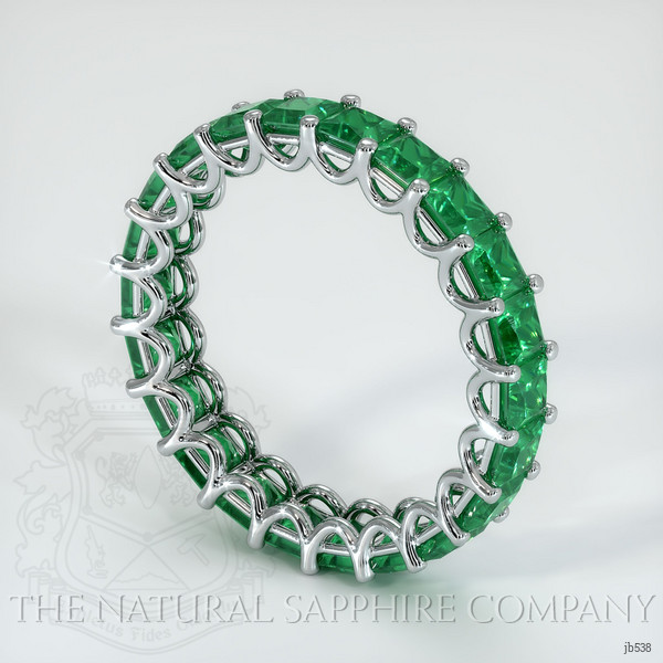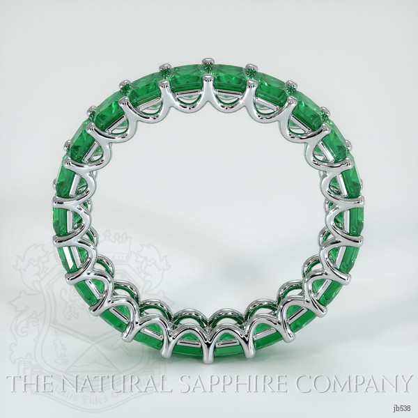 The use of princess-cut stones in this eternity band is a masterstroke, marrying the elegance of emeralds with the modernity of their geometric shape. The clean lines of the princess cut enhance the natural allure of the emeralds, showcasing their breathtaking color and clarity. Set in a continuous loop, these stones symbolize eternal love and commitment, making this band a quintessential choice for those looking to make a lifelong statement. The high polish of the band itself provides an exquisite contrast with the green hues of the emeralds, creating a visual interplay that grabs attention and admiration.