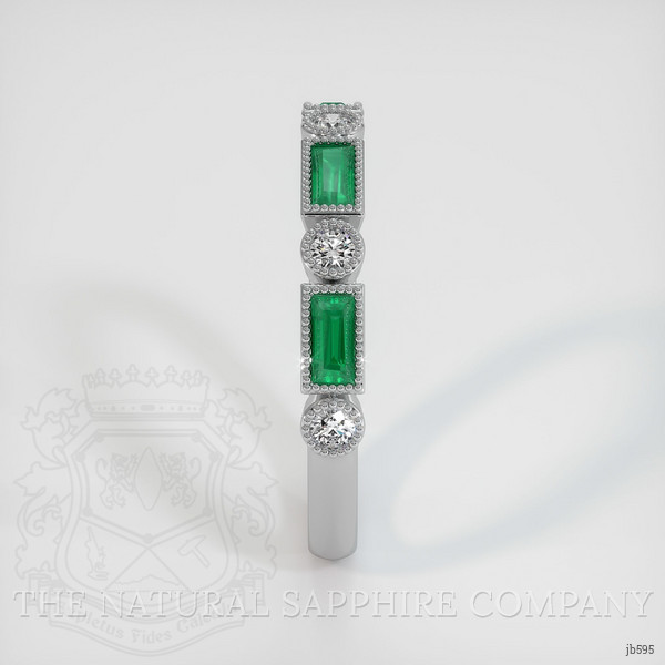 The side stones of this piece include a harmonious combination of diamonds and emeralds, each cut with precision to achieve maximum brilliance and color display. The diamonds, round in shape, are masterfully faceted to enhance their natural sparkle and provide a timeless white luster. Complemented by straight baguette-shaped emeralds, their rich green hue provides a striking contrast with the diamonds, creating a sophisticated interplay of color. Expert craftsmanship ensures that the gems are securely set, evident in the meticulous alignment and uniformity that characterize the ring's design.