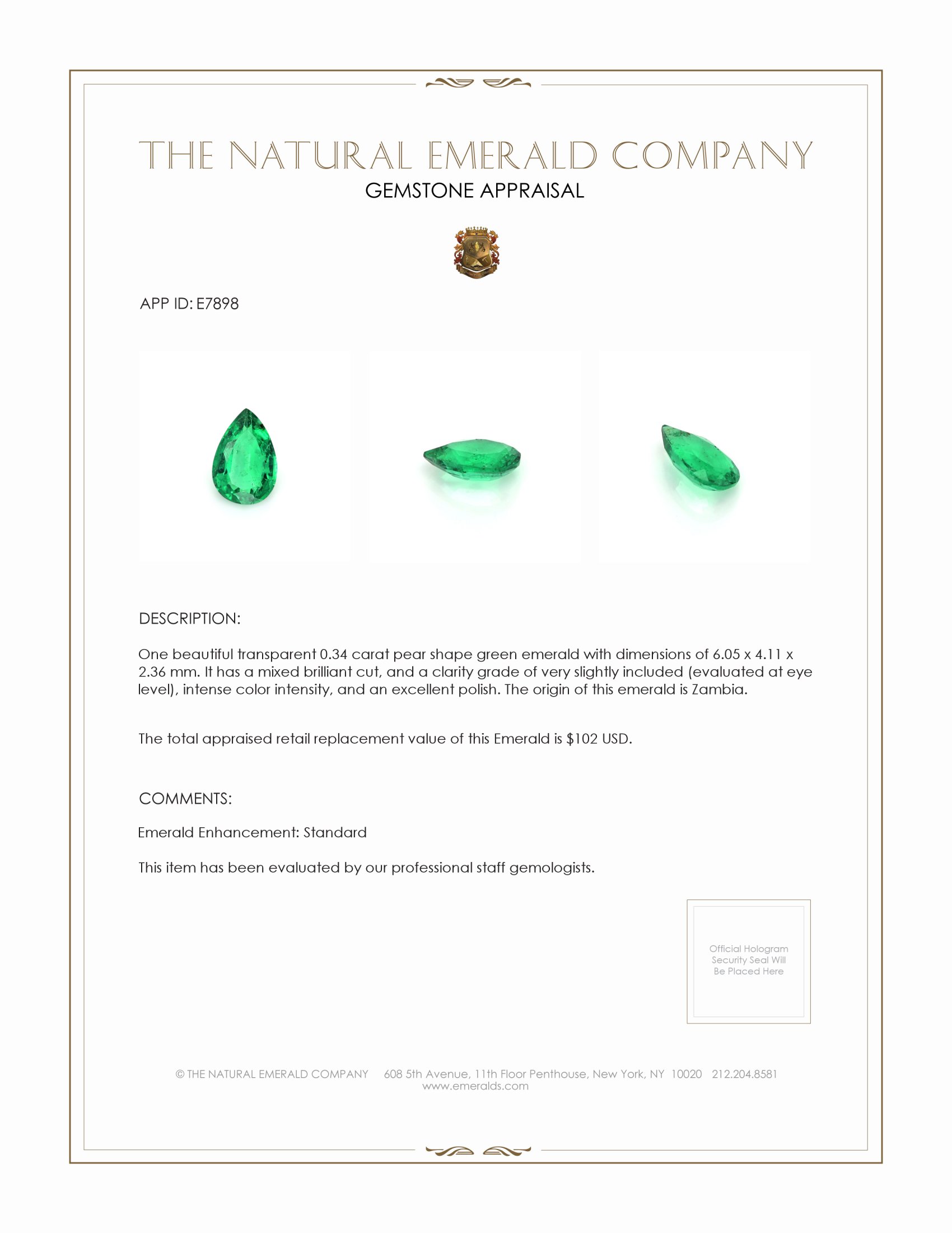 Imagine holding a piece of Earth's timeless beauty in your hands, a gemstone that tells a story of elegance and wonder. This exquisite 0.34 carat pear-shaped emerald from The Natural Emerald Company is not just a jewel, but a treasure that captures the heart's deepest emotions. Its lush green hue, a stunning spectrum of vibrant emerald energy, is a testament to nature's unparalleled artistry. With dimensions of 6.05 x 4.11 x 2.36 mm, this emerald’s delicate yet enchanting size makes it a perfect centerpiece for a memorable piece of jewelry. The mixed brilliant cut enhances the captivating play of light, dancing across the stone with every movement.