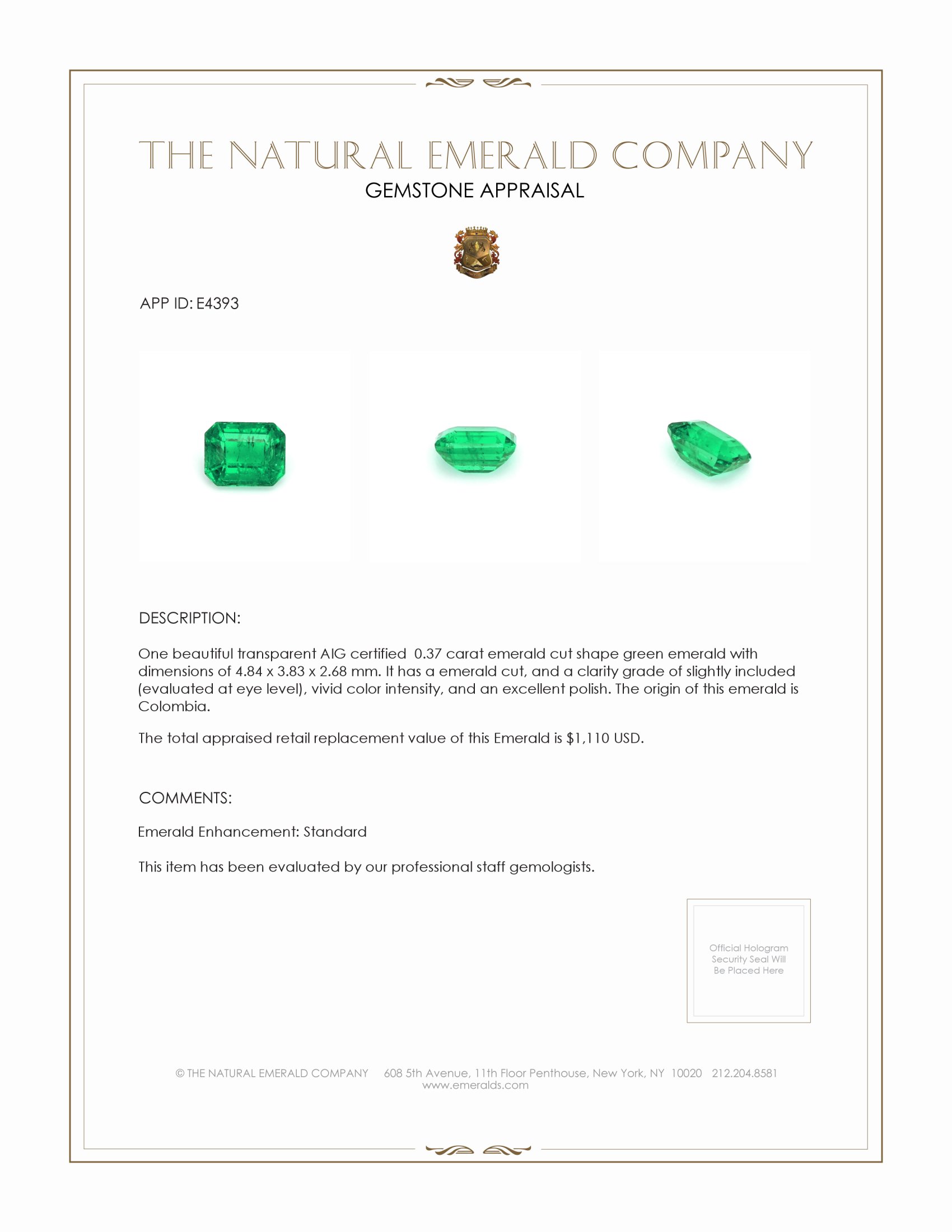 Embrace the allure of one of nature's most captivating treasures with this splendid 0.37 carat emerald. The emerald's story is as old as time itself, reaching back thousands of years to the lush landscapes of Colombia, famed for producing gems of exceptional quality. With its distinguished emerald cut shape, this gemstone embodies a classic beauty that has captivated admirers throughout history. Its dimensions, a perfect 4.84 x 3.83 x 2.68 mm, grant it an elegant presence while maintaining a versatile size that suits a variety of settings.