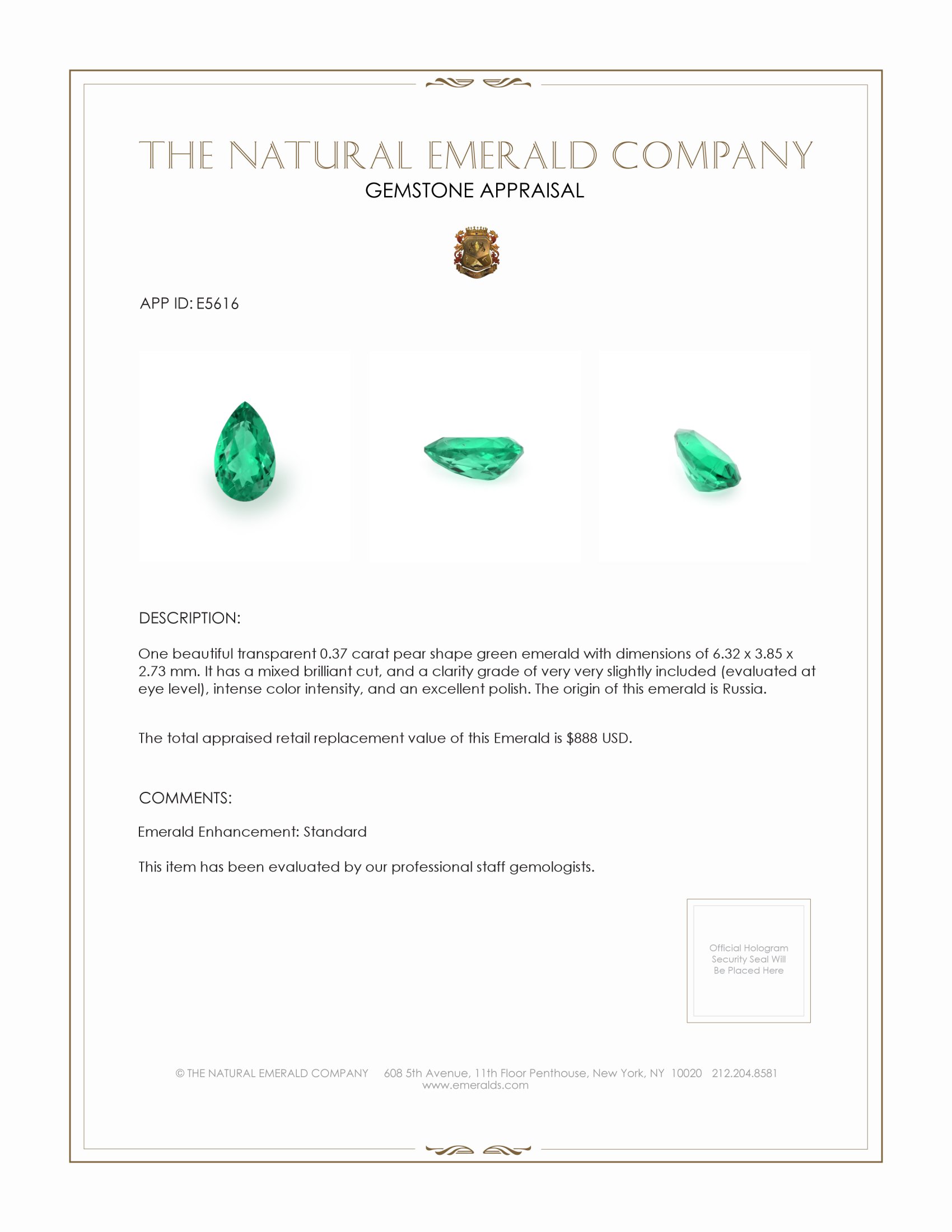 When considering the acquisition of a fine gemstone, particularly a jewel as alluring as an emerald, there are several key attributes to bear in mind. This exquisite 0.37 carat pear-shaped green emerald from The Natural Emerald Company embodies many of these sought-after qualities, beginning with its origin. The source of any gem speaks volumes about its journey and character. This superb emerald hails from Russia, a region celebrated for its rich geological deposits and pristine emerald specimens. Russian emeralds are distinguished for their spectacular saturation, which influences the vibrancy and life of the stone. With an intense color intensity, this gem reflects a deeply saturated green hue, an aspect that signifies a higher quality and is particularly prized by connoisseurs and collectors globally.