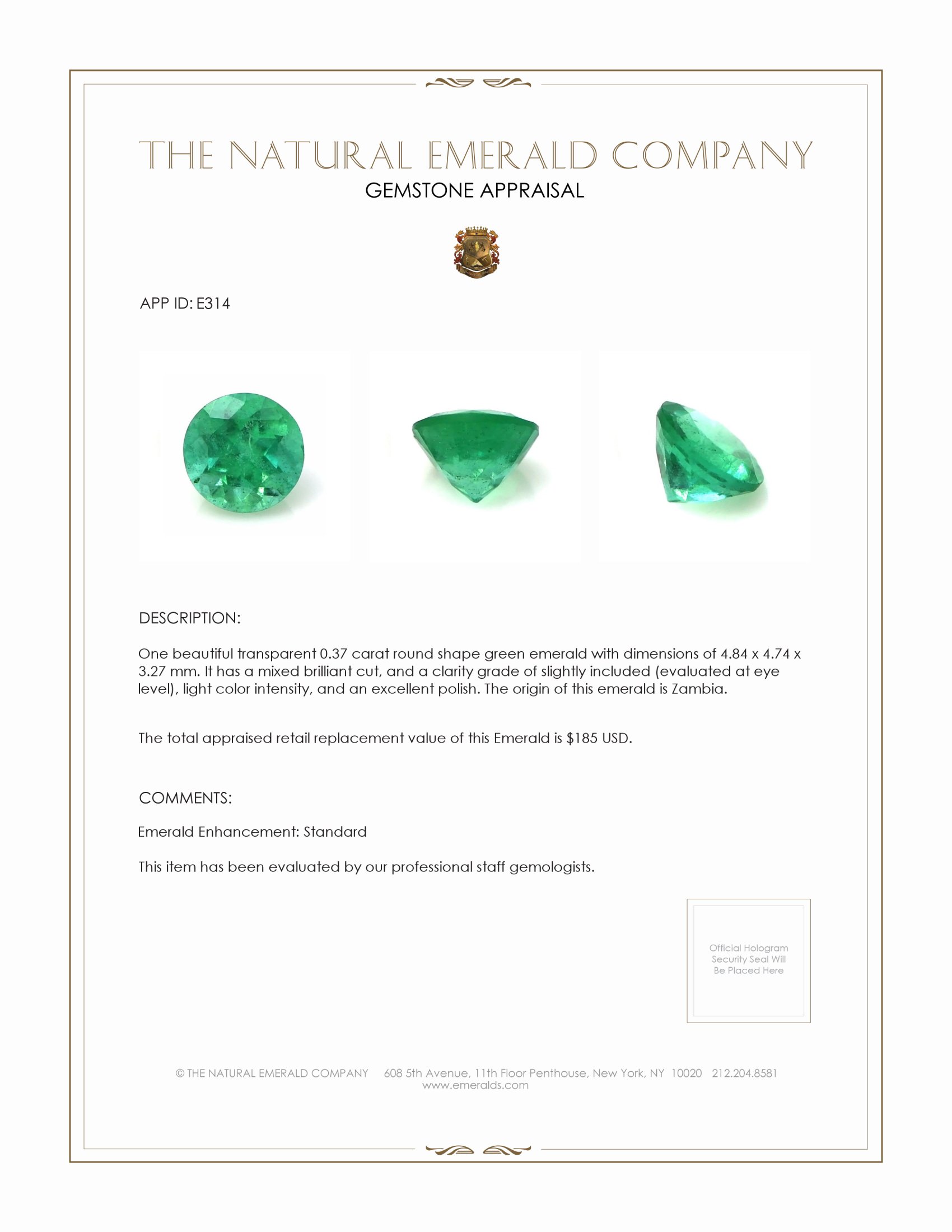 This exquisite emerald, sourced from the renowned mines of Zambia, is a testament to the artistry and precise craftsmanship that define The Natural Emerald Company. Weighing in at 0.37 carats, this transparent gemstone captivates with its round shape and carefully executed dimensions of 4.84 x 4.74 x 3.27 mm. The round configuration, paired with a mixed brilliant cut, elevates its visual allure by maximizing its interaction with light. This sophisticated cutting technique results in an enchanting sparkle, showcasing the superior skill of our master craftsmen who understand that every facet must cooperate to deliver optimal brilliance.