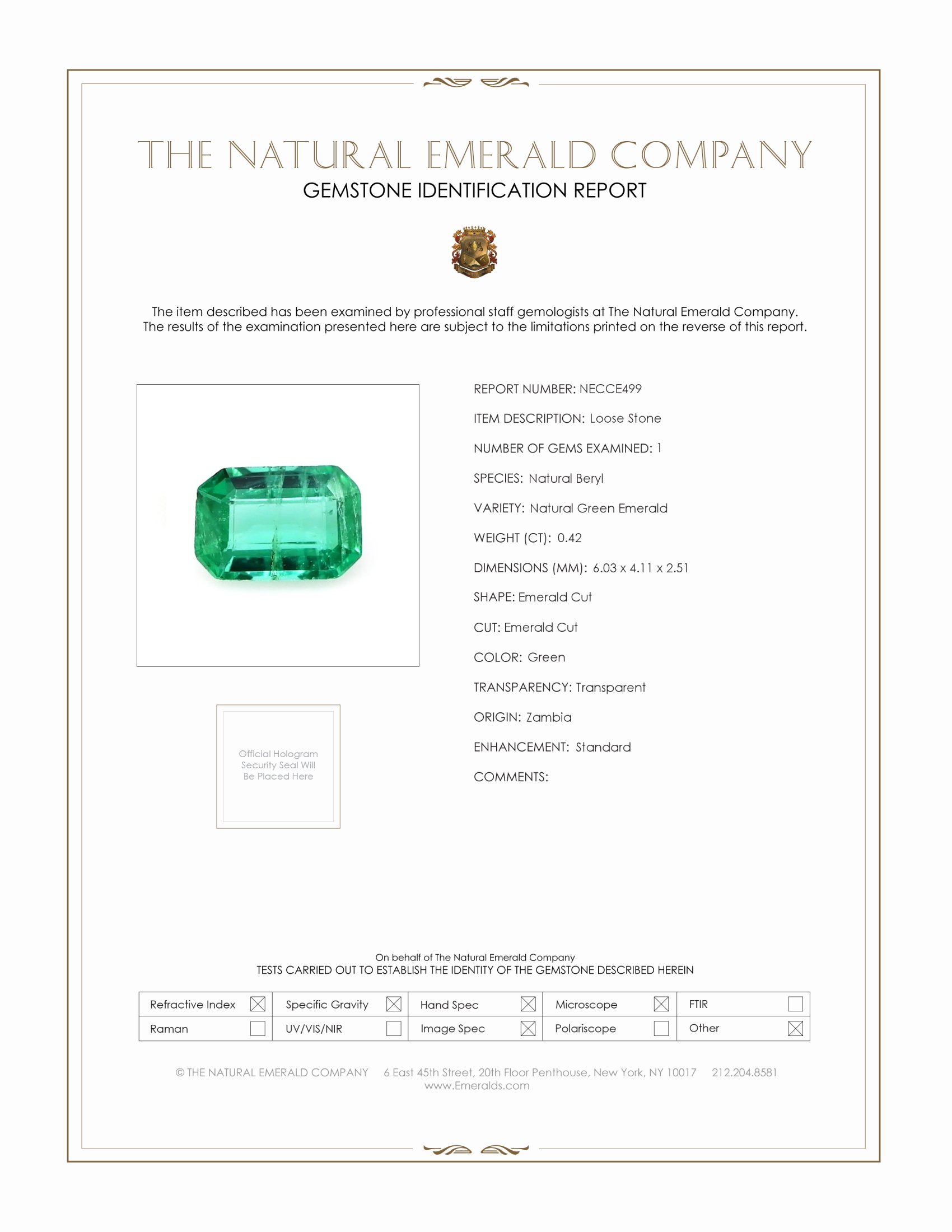 The beautiful, transparent 0.42 carat emerald cut green emerald with the dimensions of 6.03 x 4.11 x 2.51 mm and is emerald cut cut, has a clarity grade of slightly included (graded at eye level), medium color intensity, and an excellent polish. The origin of this emerald is Zambia.