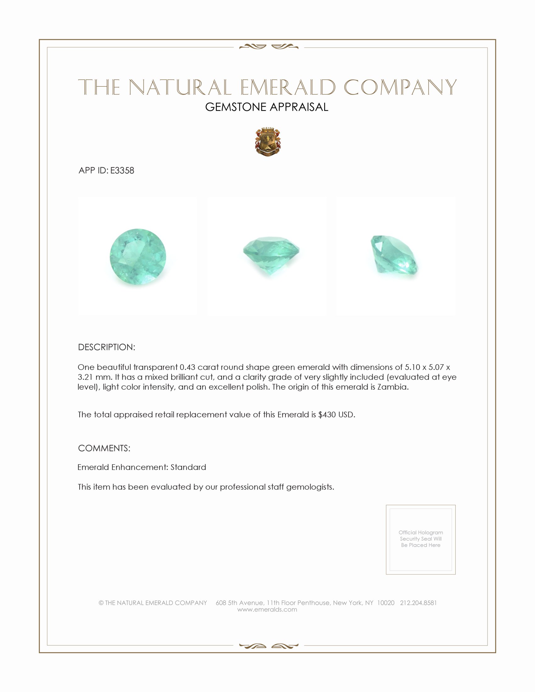The emerald is one of the most revered gemstones in history, often associated with royalty and revered for its lush green hue, reminiscent of the most vibrant landscapes. Our offering at The Natural Emerald Company is an exquisite 0.43 carat green emerald, a true testament to nature's artistry and mankind's craftsmanship. This particular emerald boasts dimensions of 5.10 x 5.07 x 3.21 mm and is skillfully cut in a mixed brilliant style, which maximizes its light performance, endowing it with a captivating sparkle. Its classification as a round shape further adds to its allure, offering timeless elegance and versatility that suits a variety of jewelry designs.