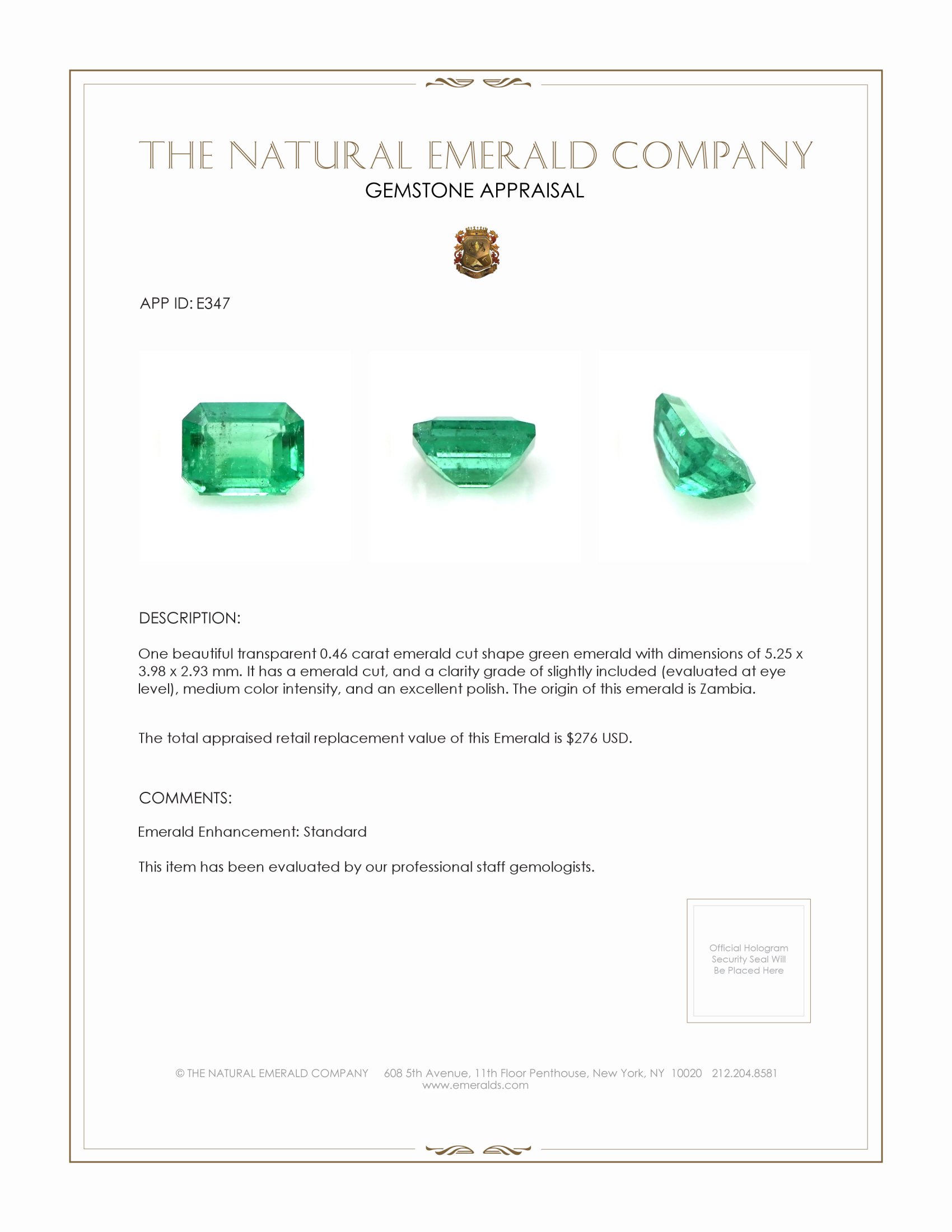 The Natural Emerald Company proudly presents a striking example of nature's artistry in the form of a transparent emerald that is both exquisite and meticulously crafted. This emerald, with a weight of 0.46 carats, exemplifies the captivating allure associated with fine emeralds. Measuring 5.25 x 3.98 x 2.93 mm, its emerald cut enhances the stone's natural brilliance and showcases its inherent color and clarity in the most appealing manner. Cut with precision, the facets of this gemstone reflect light with remarkable effectiveness, presenting a visual feast of glistening green hues. When compared to other gemstones within its category, this emerald's reflective qualities are noteworthy, with its polished surface contributing to an overall brilliance that is distinct and impressive.