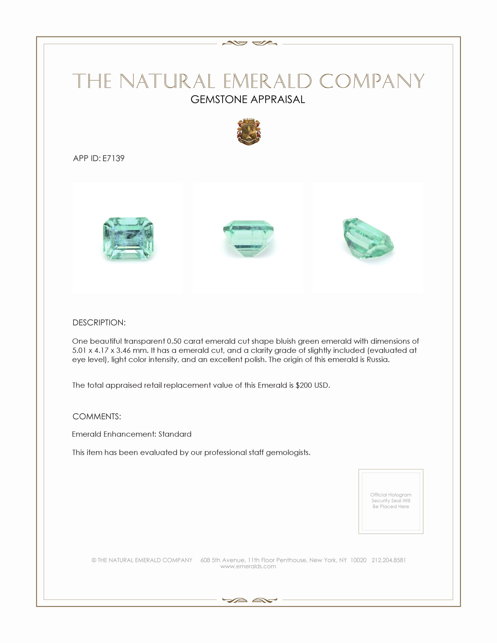 Introducing an exquisite 0.50 carat emerald cut emerald offered by The Natural Emerald Company. This captivating gemstone is a true embodiment of elegance and opulence, featuring a transparent appearance with striking bluish-green hues. Its dimensions of 5.01 x 4.17 x 3.46 mm perfectly complement its manageable size, making it an excellent choice for various jewelry settings. This particular emerald boasts an emerald cut, a classic shape known for its ability to emphasize clarity and color in a gemstone. The depth and precision of the cut ensure that light reflects beautifully, enhancing the gem’s innate brilliance and sparkle.