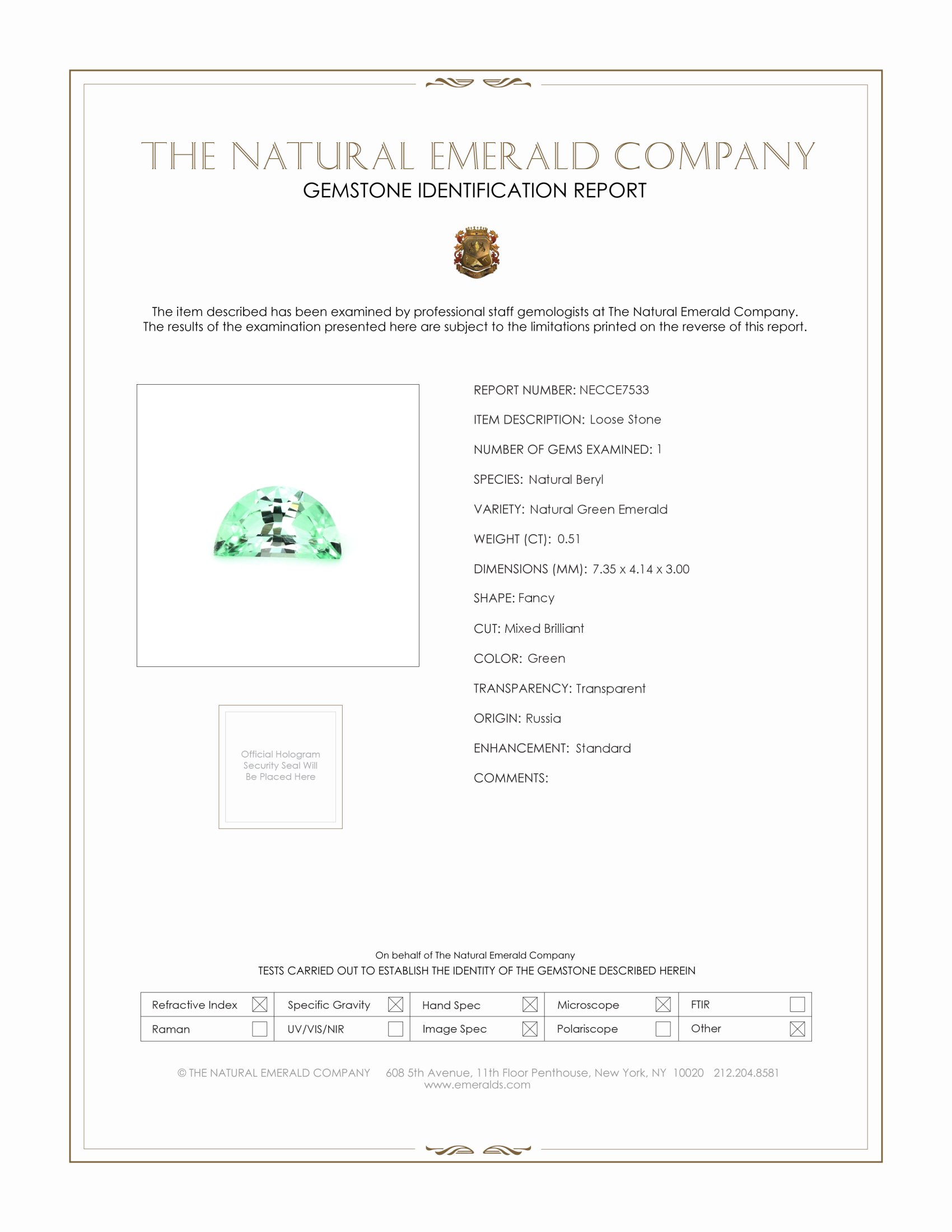 In the heart of Russia’s majestic landscapes, beneath ancient layers of earth, lies the story of a treasure waiting to unveil itself. This beautiful transparent 0.51 carat green emerald, a marvel of natural beauty, begins its journey from deep under Russian soil. It’s a testament to the land’s rich mineral wealth and the skill embedded in generations of gemstone mining. Nestled within the embrace of this unblemished land, the emerald absorbs the essence of its origin, marked by resilience and splendor, before it earns its place among the finest gemstones at The Natural Emerald Company.