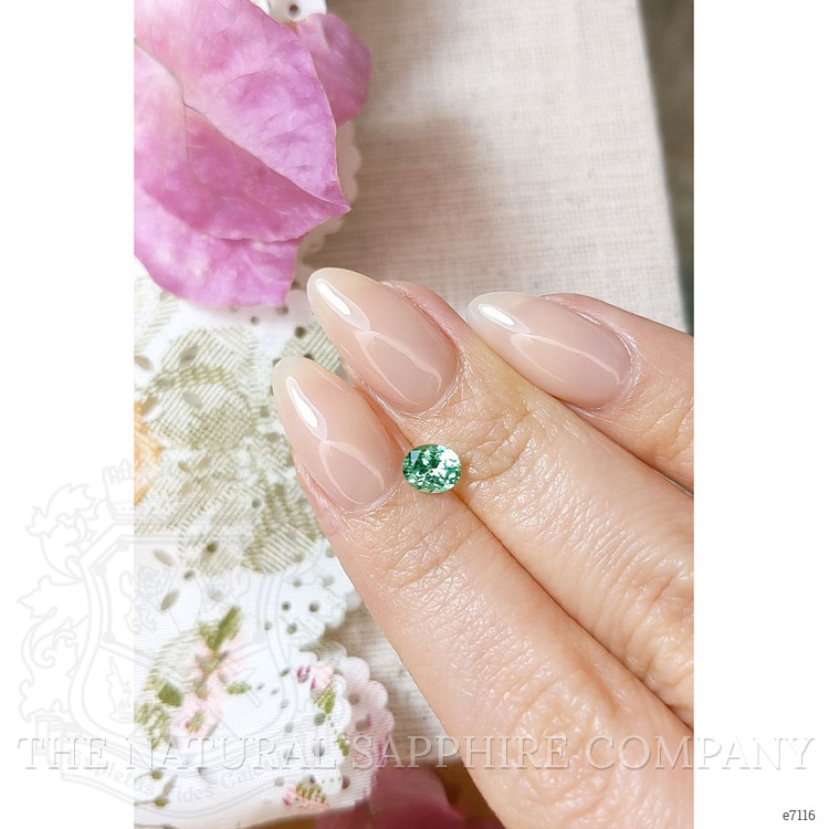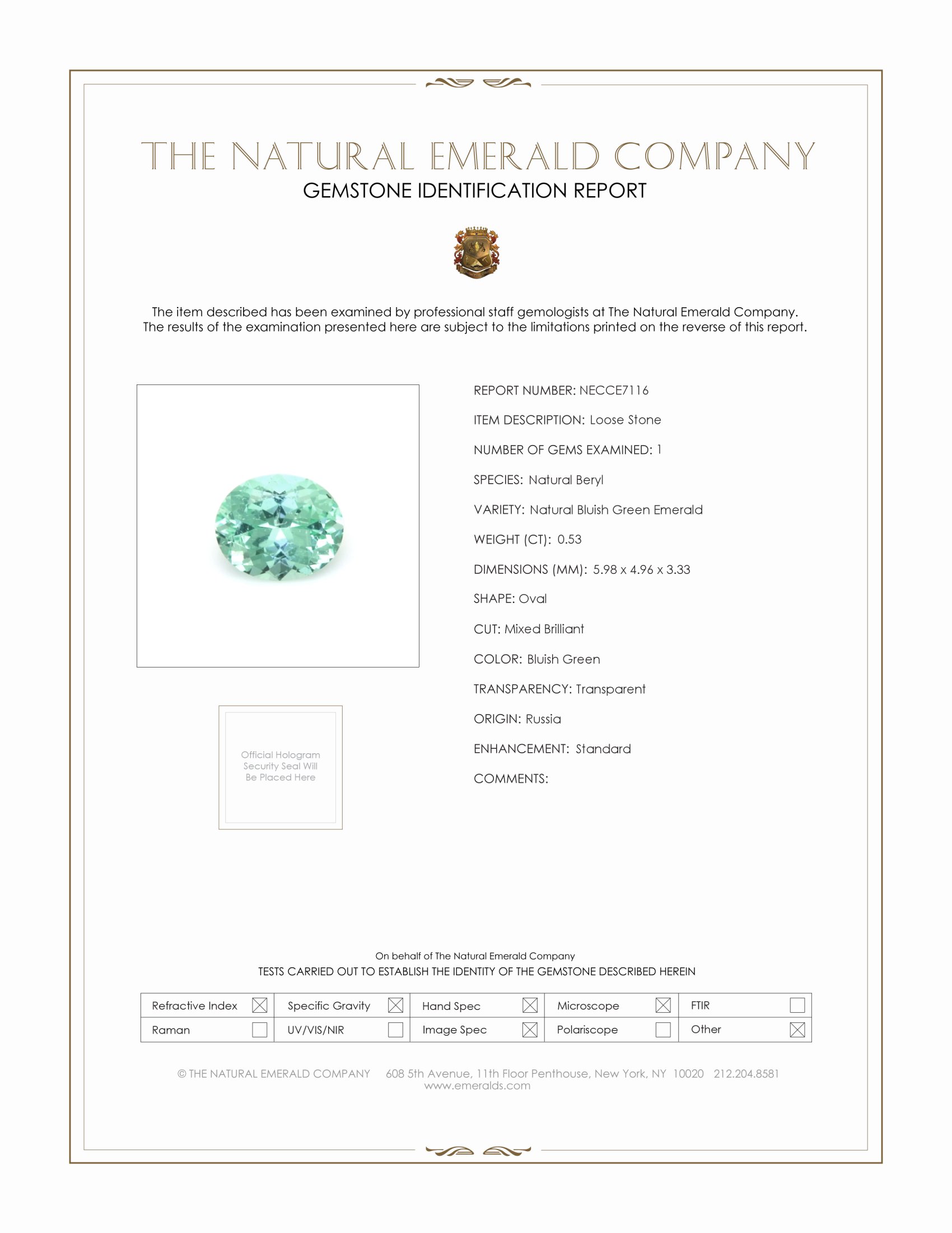 Introducing a remarkable gemstone from The Natural Emerald Company, this exquisite 0.53 carat emerald presents an engaging blend of transparent bluish-green hues. The oval shape and dimensions of 5.98 x 4.96 x 3.33 mm make this emerald a perfect center stone for any striking jewelry piece. Its well-proportioned size complements various design aesthetics, ensuring that it draws attention without overwhelming other decorative elements. This gem's medium light color intensity further enhances its unique appeal, offering a subtle yet captivating vibrancy.
