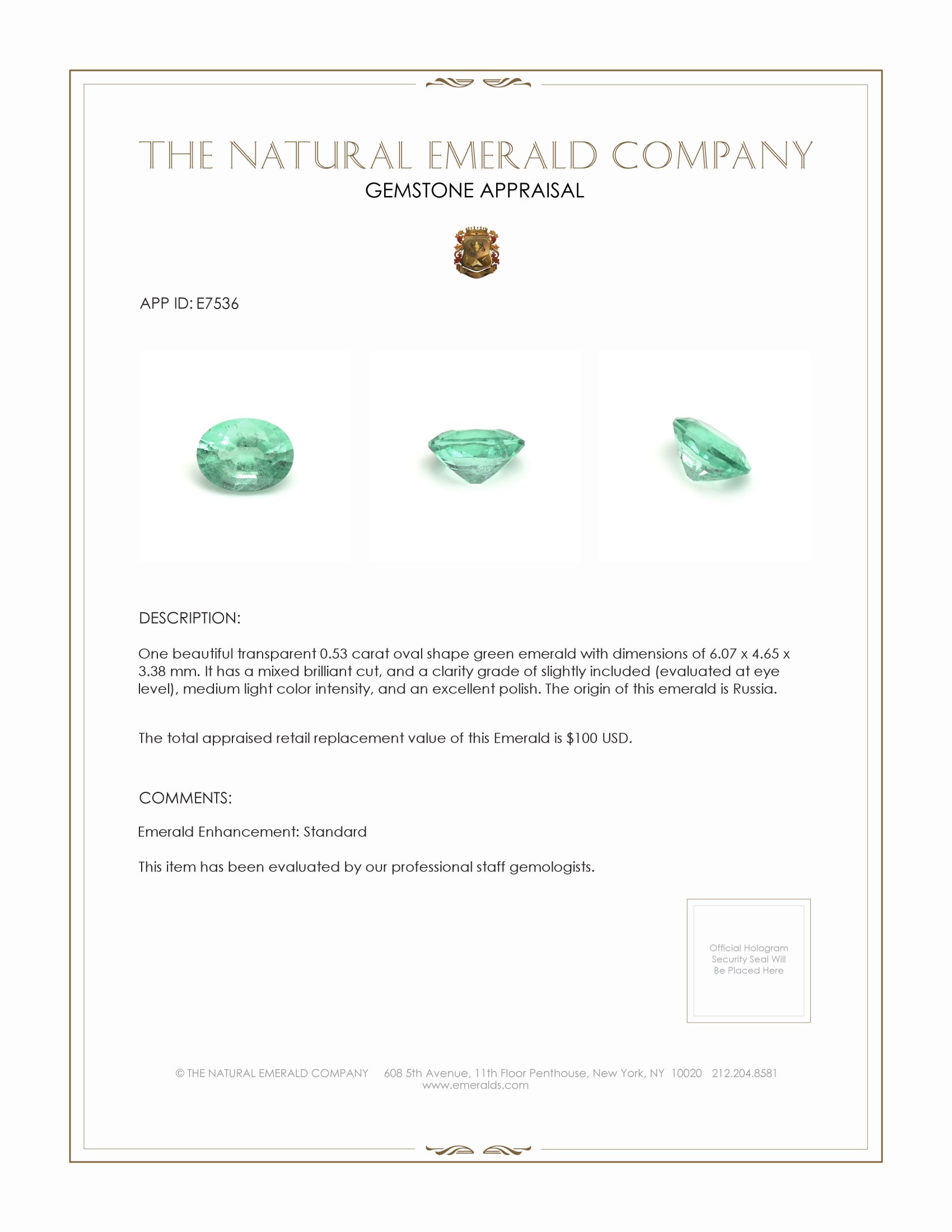 Introducing an exquisite treasure from The Natural Emerald Company, our 0.53-carat oval-shaped green emerald represents the epitome of elegance and versatility. This exceptional gemstone, measuring 6.07 x 4.65 x 3.38 mm, features a mixed brilliant cut that alluringly captures light, creating a captivating sparkle from every angle. With its medium light color intensity and slightly included clarity grade, this emerald brings a natural charm that uniquely sets it apart from other gemstones in the market. Our emerald not only meets the highest standards of quality but offers a window into the beauty of Russian origin with unparalleled craftsmanship and attention to detail.