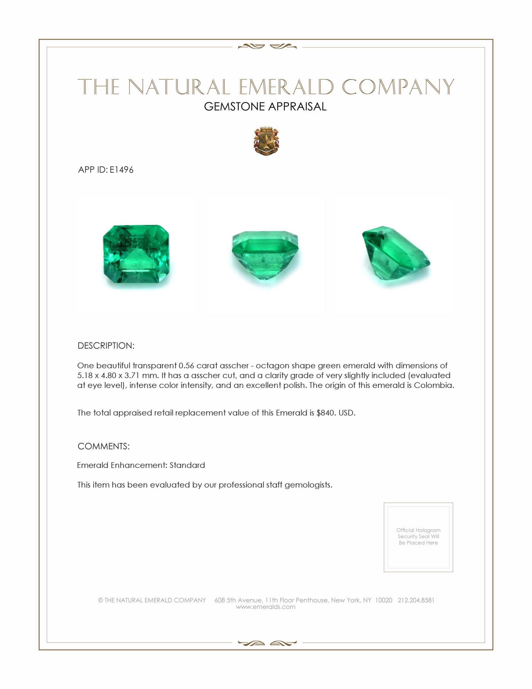 Discover a gemstone that truly stands apart with The Natural Emerald Company. This extraordinary asscher-cut green emerald, weighing 0.56 carats, captivates all who gaze upon it. Its spectacular dimensions of 5.18 x 4.80 x 3.71 mm combine a harmonious balance with its octagon shape, emphasizing an unparalleled brilliance. Sourced from the finest mines in Colombia, this emerald boasts an intense color intensity, making it a remarkable treasure in the world of gemstones.