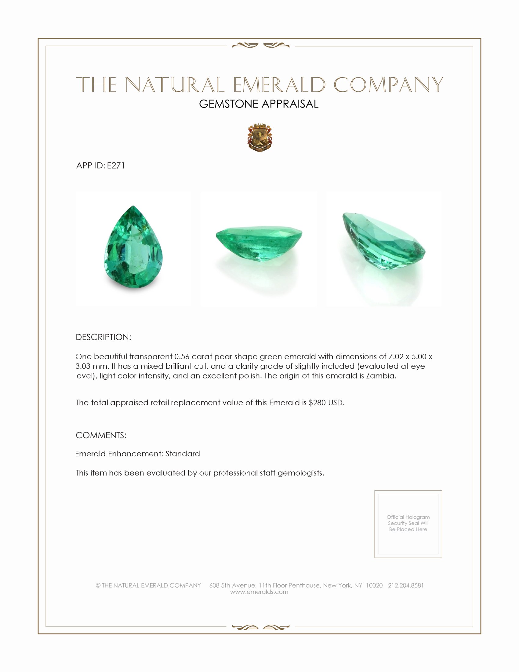 Discover the timeless allure of our exquisite 0.56 carat pear-shaped green emerald, a gem that carries within it a rich heritage of elegance and enchantment. With its lustrous brilliance and gentle embrace of light, this Zambian emerald captivates hearts just as it has for generations past. Imagine draping yourself or a loved one in the legacy of Cleopatra, who adorned herself with similar treasures that represented her divine beauty and power. Our pear-shaped emerald is more than just a piece of jewelry; it is a symbol of love, resilience, and everlasting grace.