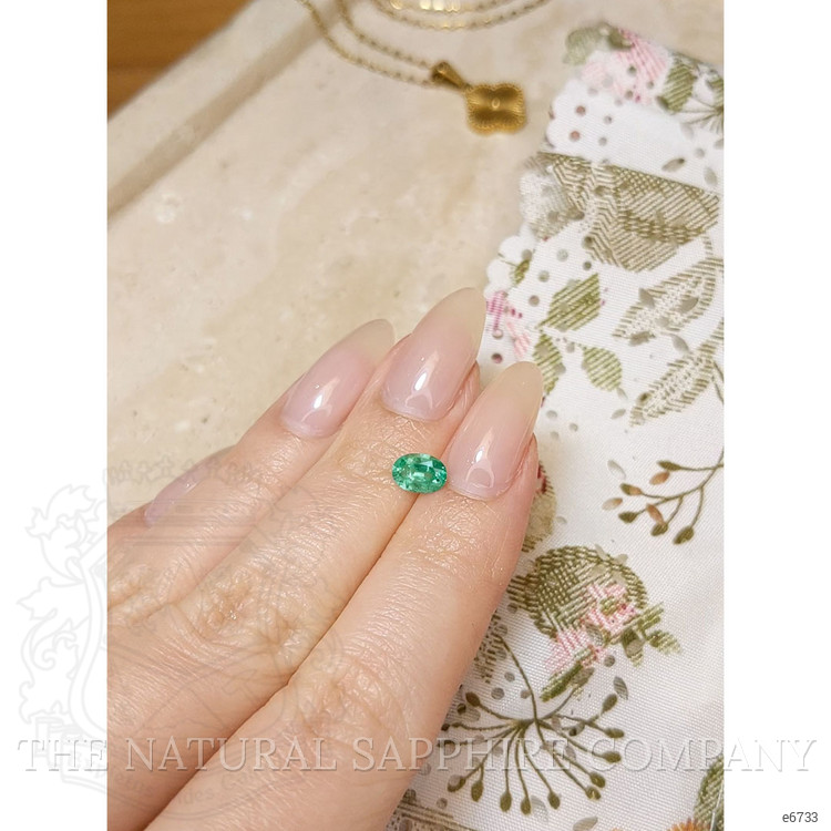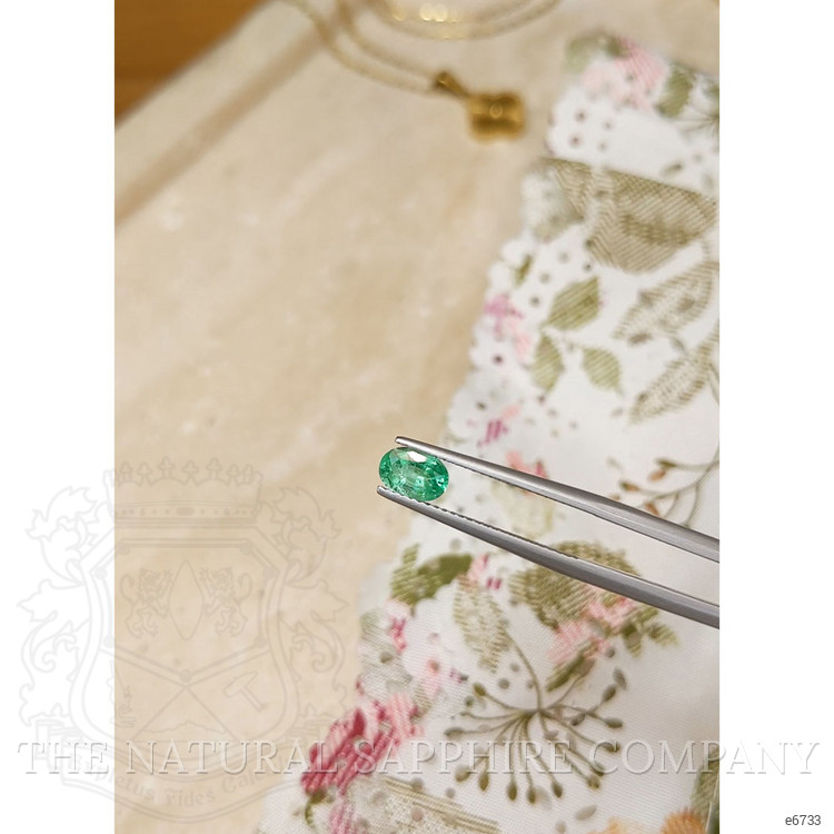 Introducing a captivating gem destined to be the jewel of any discerning collector's trove, this exquisite 0.57 carat oval-shaped green emerald from The Natural Emerald Company is a stunning example of nature's magnificence. With dimensions measuring 6.82 x 4.80 x 3.10 mm, this emerald showcases a masterfully executed mixed brilliant cut that enhances its natural beauty and brilliance. A testament to expert craftsmanship, its excellent polish serves as a testament to the time and skill invested in bringing out the gem's innate luster and allure. An emerald such as this, with a medium light color intensity, presents a fascinating blend of hues that strike a harmonious balance between the more commonly seen deep greens and lighter emerald shades.