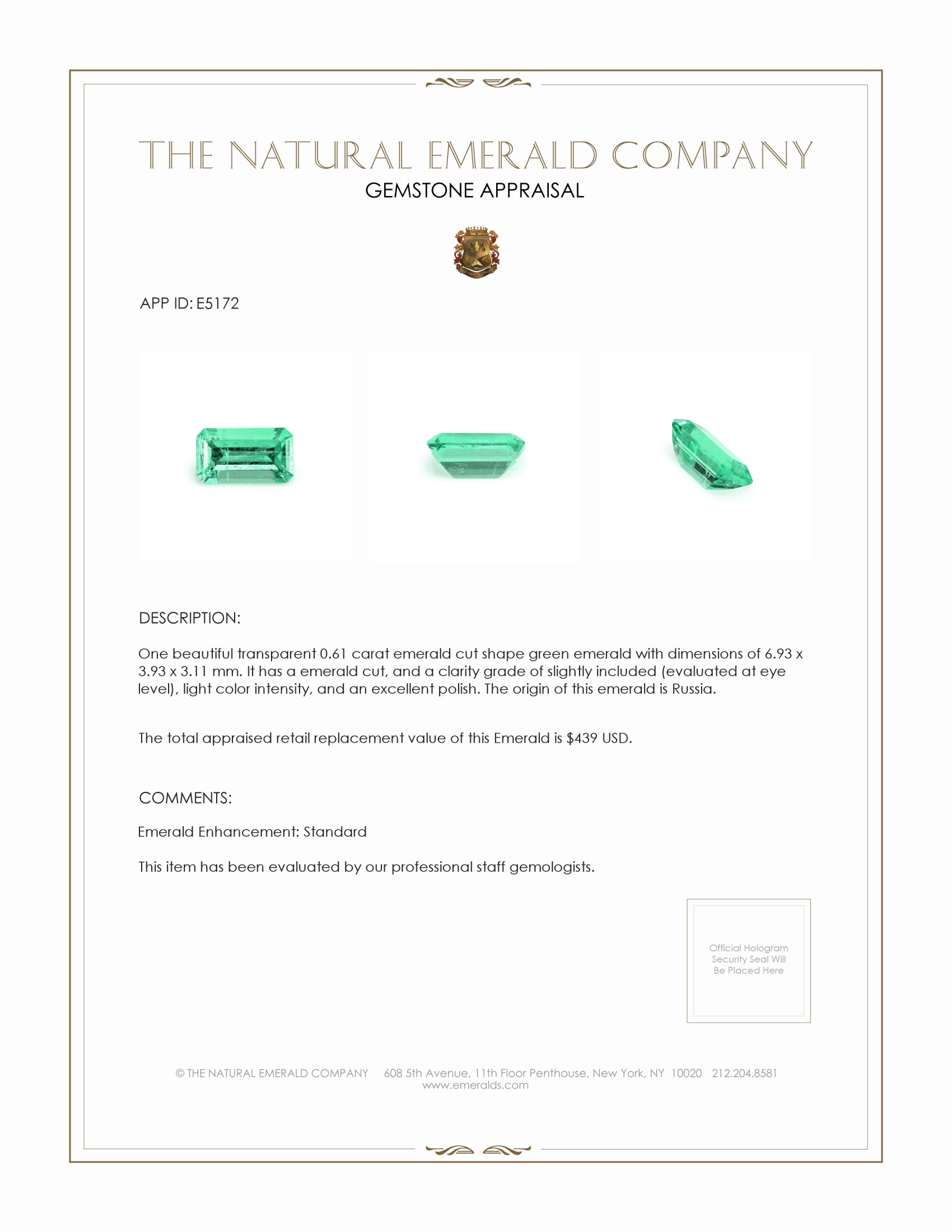 Introducing a rare and exceptional gemstone that captures the essence of opulence and distinction, a magnificent 0.61 carat emerald irresistibly invites you to join the select few who can claim ownership of such an exclusive treasure. This captivating piece from The Natural Emerald Company is a testament to nature's unparalleled artistry. One gaze into its depths and you will understand why this emerald is a coveted rarity, worthy of the most discerning collectors. The dimensions of 6.93 x 3.93 x 3.11 mm provide this gemstone with a delicate yet robust presence. Its emerald cut showcases not only precision but also the meticulous craftsmanship that enhances the emerald’s inherent beauty while ensuring that its brilliance shines from every angle.