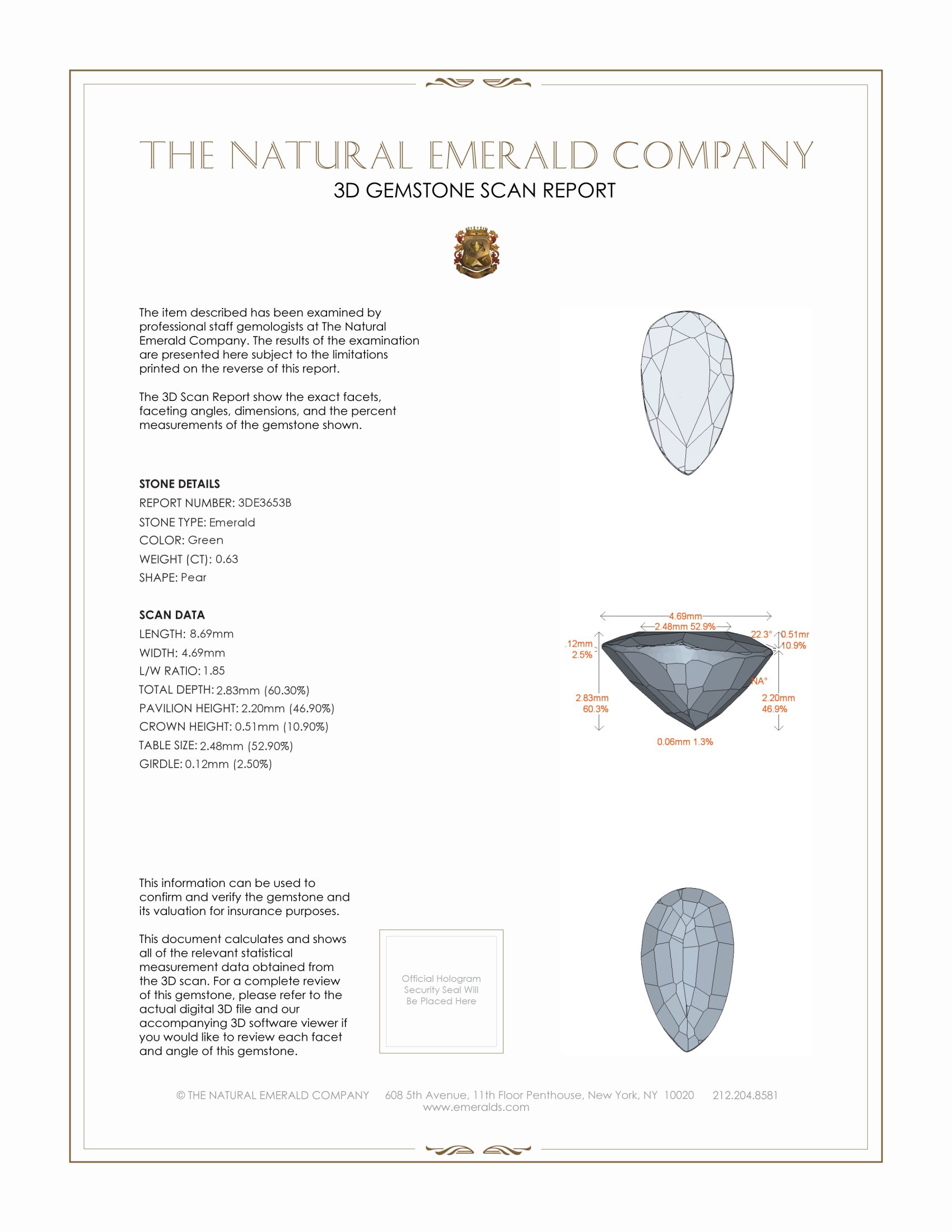 Discover the pinnacle of elegance and rarity with our exquisite transparent 0.63 carat pear-shaped green emerald. At The Natural Emerald Company, we understand the discerning tastes of our customers and are dedicated to offering nothing but the finest gemstones that satisfy your desires for both beauty and authenticity. This emerald is not just a gemstone; it's an experience waiting to adorn your collection or mark a special occasion. The pear-shaped design, perfectly dimensioned at 8.69 x 4.69 x 2.83 mm, captures an elegant teardrop silhouette that enhances its visual allure from every angle.