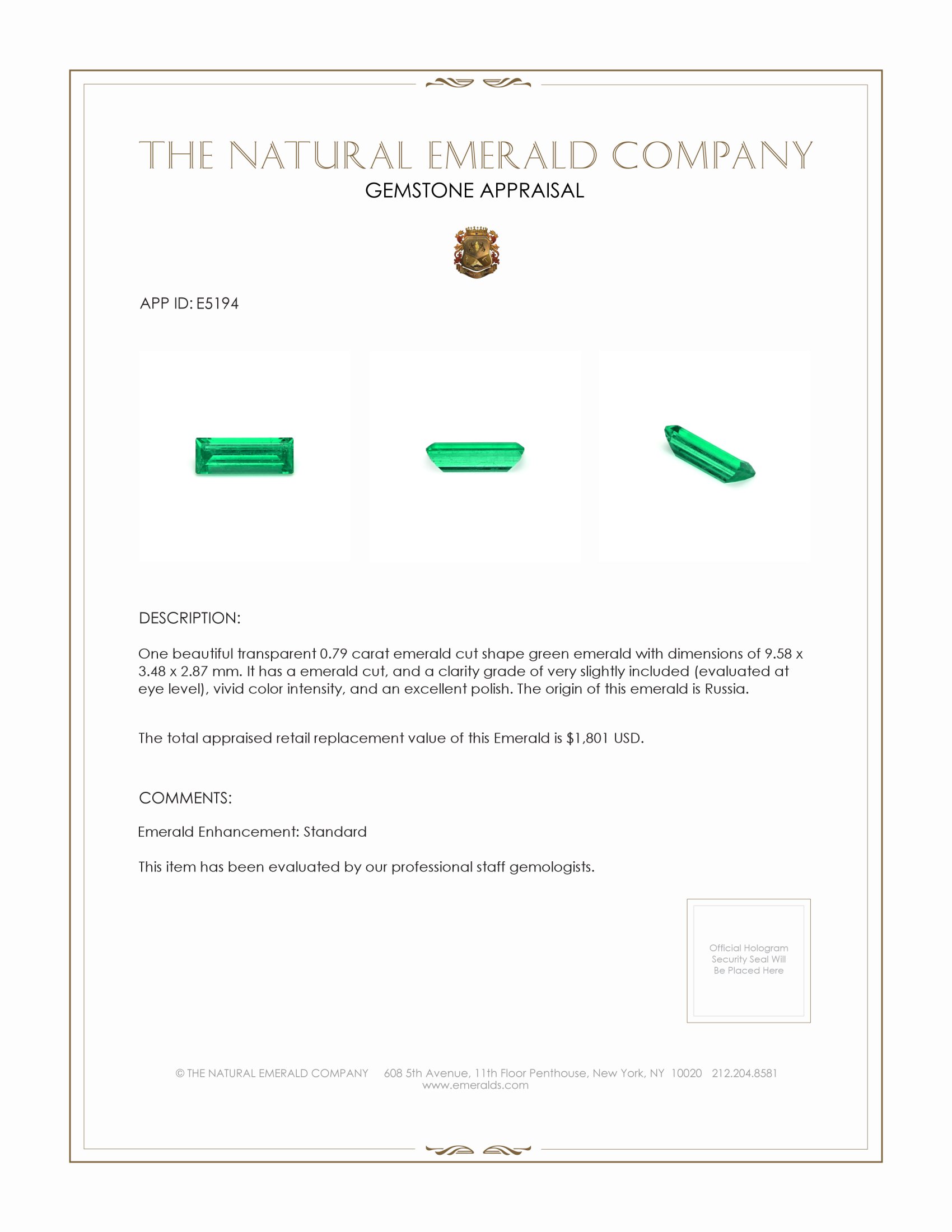 Introducing a remarkable specimen from the esteemed gemological region of Russia. The Natural Emerald Company is proud to present a stunning 0.79 carat emerald that embodies both the exquisite allure and refined qualities sought by connoisseurs around the globe. Fashioned in a classic emerald cut, this gemstone proudly displays dimensions of 9.58 x 3.48 x 2.87 mm, showcasing a mastery of traditional gem-cutting techniques which enhance its inherent translucence and brilliance. The clarity grade of very slightly included ensures that any inclusions present are minimal and do not detract from the stone's overall appearance, adding to its unique character and charm.