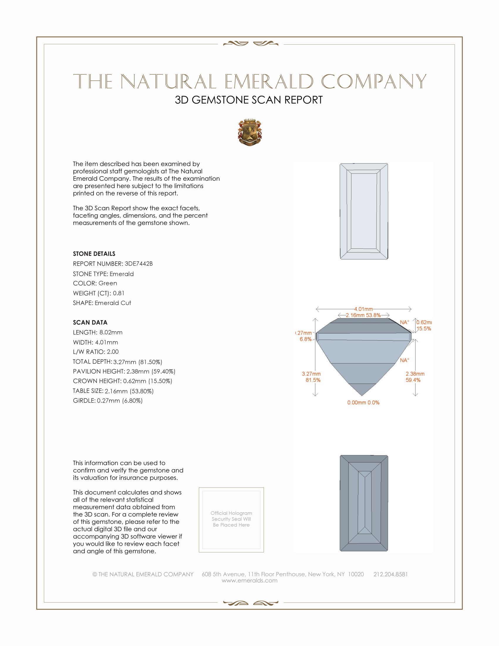 Introducing an exquisite offering from The Natural Emerald Company, a transparent 0.81 carat emerald that epitomizes timeless elegance through its impeccable craftsmanship and innate beauty. This emerald is cut into a classic emerald shape measuring 8.02 x 4.01 x 3.27 mm—a precise form that enhances its inherent allure. Designed to catch light from every angle, the impeccable proportions amplify the natural medium intensity color, casting a captivating display reminiscent of serene landscapes.