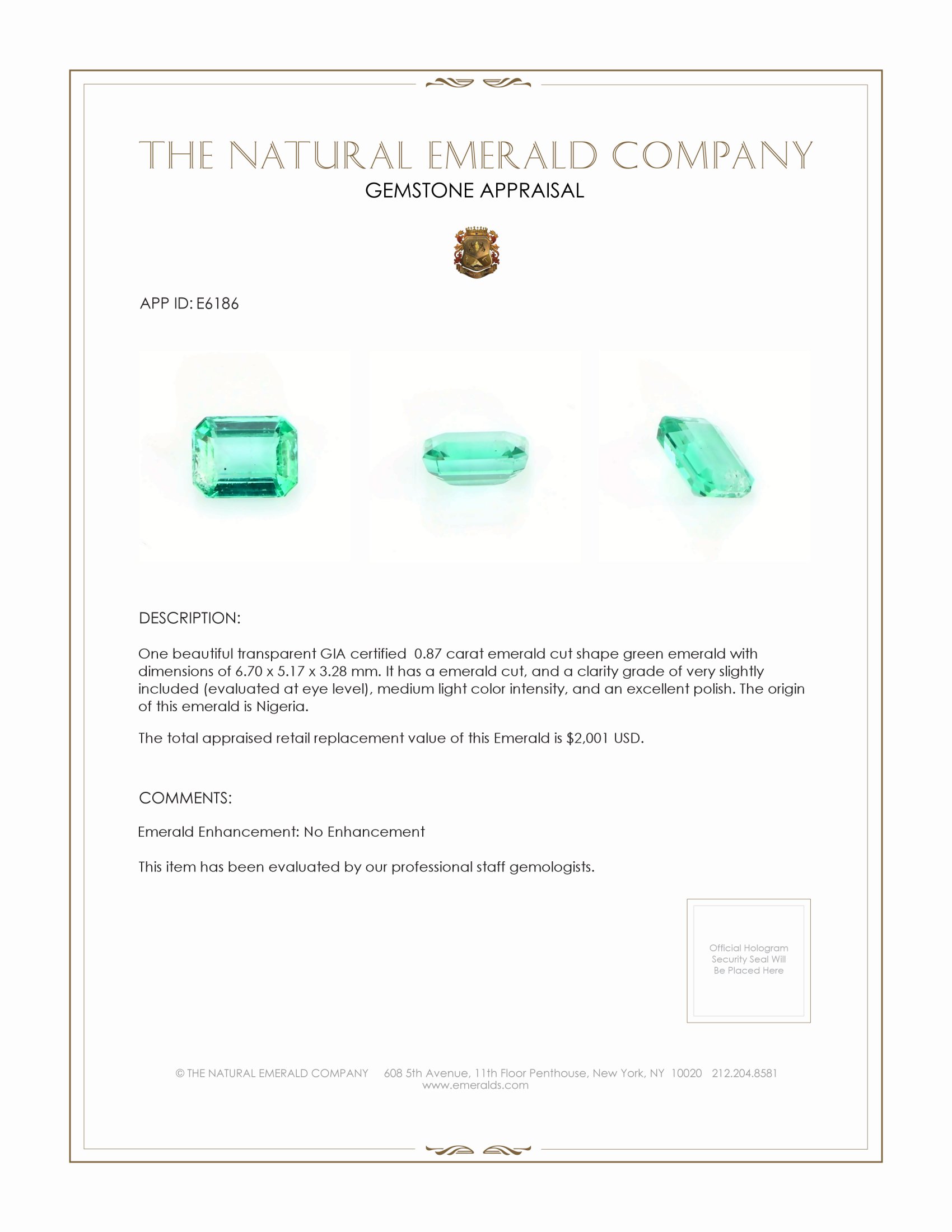 In the world of gemstones, few can boast the rich history and allure of the emerald. Revered by ancient civilizations and scepters of royalty alike, the emerald has always symbolized renewal, growth, and the majestic splendor of nature. Our exquisite GIA certified emerald, sourced from the verdant landscapes of Nigeria, continues this legacy with its breathtaking beauty and timeless charm. This gem, a stunning transparent emerald of 0.87 carats, takes on the classic emerald cut, adored not only for its elegant quadrilateral facets but also for maximally showcasing the stone's intrinsic nuances of color and clarity. The medium light color intensity of this jewel provides a fresh and tranquil vibrancy, serene yet unmistakable amidst everyday surroundings.