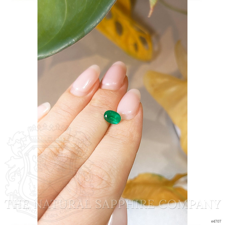 The featured emerald from The Natural Emerald Company exemplifies the pinnacle of gemstone craftsmanship with its exquisite 0.88 carat oval shape, measuring 7.17 x 5.17 x 4.05 mm. This elegant stone is expertly fashioned with a mixed brilliant cut, meticulously designed to augment its inherent properties of light reflection and brilliance. The oval shape harmoniously balances the emerald’s dimensions, enhancing its visual appeal and ensuring an optimal play of light across the gem's surface. The proportions of this elegant piece have been calibrated with precision to maximize its interplay with light, offering a visual display that captivates the beholder’s eye.