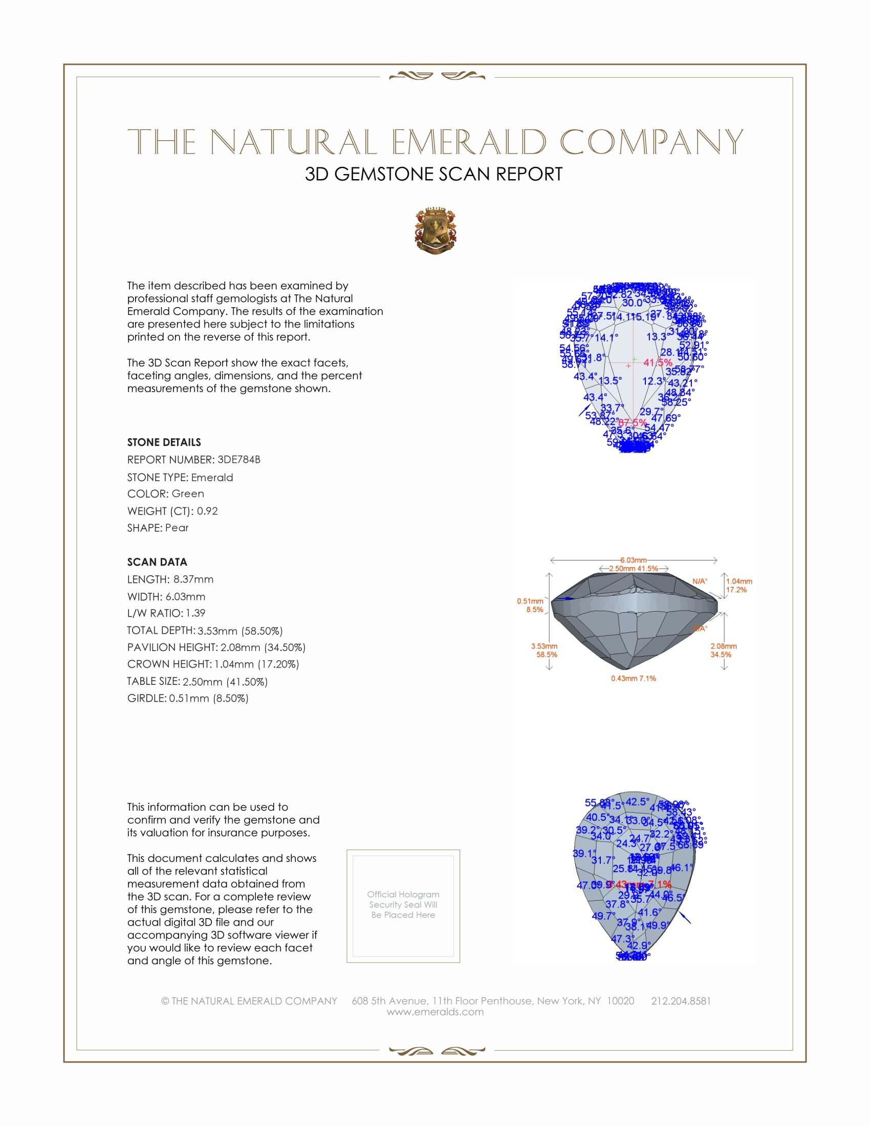 Crafted with precision by skilled artisans, this exceptional emerald, measuring 8.37 x 6.03 x 3.53 mm, captures the imagination not just through sight but through the story embedded within each facet. Its gentle pear shape, the result of a meticulous mixed brilliant cut, enhances its undeniable charm. Every angle reveals a dance of light, a kaleidoscope of greens that speak of lush forests kissed by the morning sun. The clarity grade, very slightly included, like whispers of air trapped within an eternal bloom, provides a window into its organic genesis, demonstrating its authenticity and connection to nature's wild embrace. Our emerald, with medium color intensity, mirrors the perfect balance found in the world's most harmonious ecosystems.