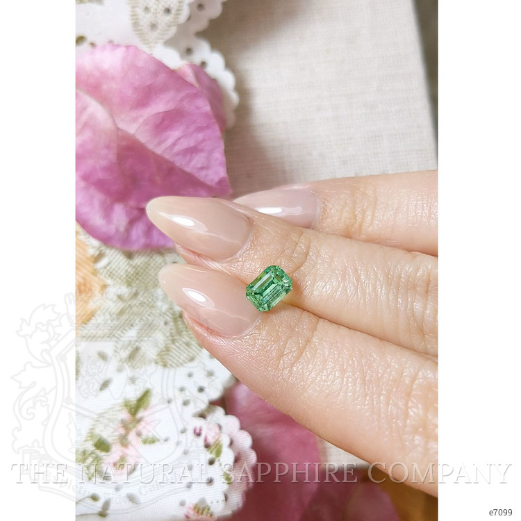 Emerging from its subterranean sanctuary, the emerald undergoes a transformation that bridges the natural artistry of the earth with the skilled craftsmanship of human hands. Our artisans, deeply experienced and dedicated to their craft, study each dimension of the raw stone with meticulous care. Measuring 6.93 x 5.03 x 4.69 mm, its emerald cut is designed to embrace its subtle intricacies, allowing its light color intensity to emerge in a captivating play of light. Although it is slightly included when inspected closely, this characteristic accentuates its authenticity and natural origins, offering a narrative of time and earth in its gentle verdant hue.