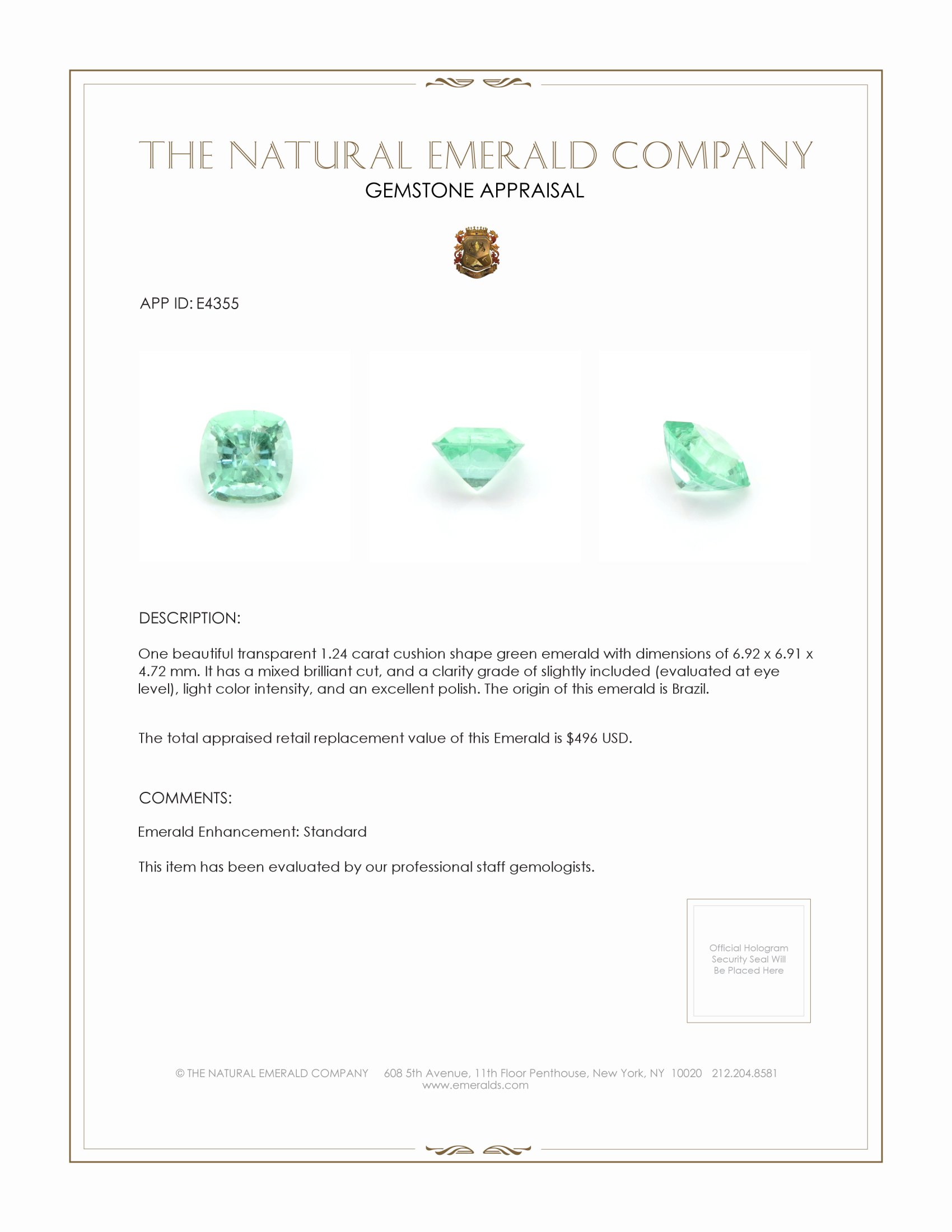 Discover a treasure of nature that radiates timeless elegance and unparalleled sophistication with our exclusive offering: a captivating 1.24 carat green emerald. This exquisite gem, crafted naturally in the mineral-rich landscapes of Brazil, is a testament to the earth's most wondrous creations. With its flawless cushion shape and dimensions standing at 6.92 by 6.91 by 4.72 mm, this emerald embodies the perfect balance of size and presence, making it a rare jewel for those with discerning taste and a penchant for magnificence.