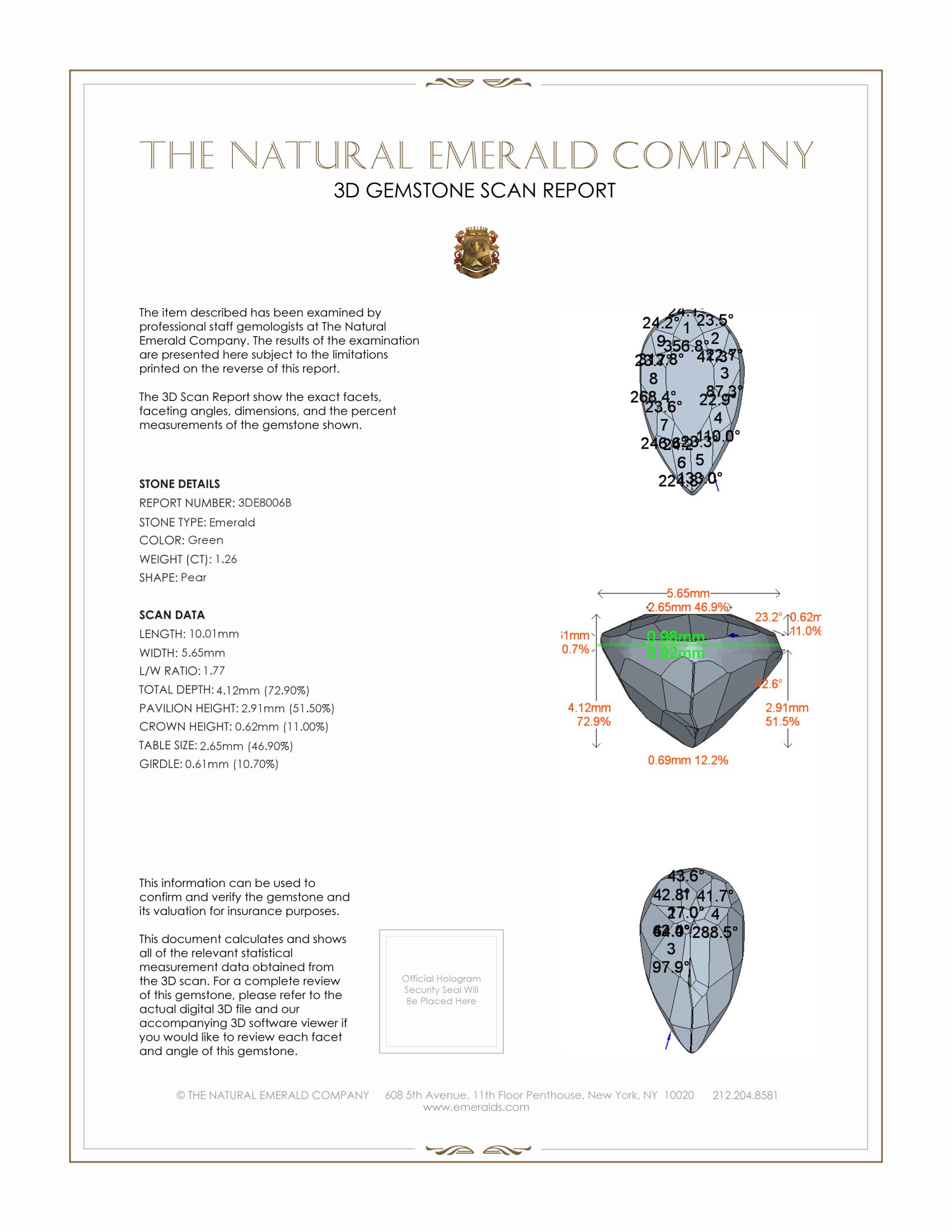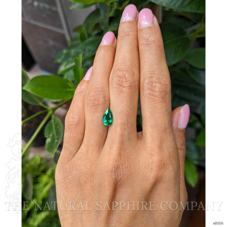 In the realm of gems where the divine and earthly hues breathe life, there rests a treasure so finely crafted that it holds the very essence of nature's verdant beauty within its facets. This 1.26 carat pear-shaped emerald, with its captivating transparency, whispers tales of lush landscapes and the whispering winds of times long gone. It spans 10.01 x 5.65 x 4.12 mm, a magnificent example of what nature perfects, mingled with the mastery and dedication of human craftsmanship. The emerald’s form—a unique pear, the shape of a dew-laden leaf slowly taking its journey to the earth—evokes a sensation of perpetual renewal, a once-again revelation of life in a verdant sea of green.
