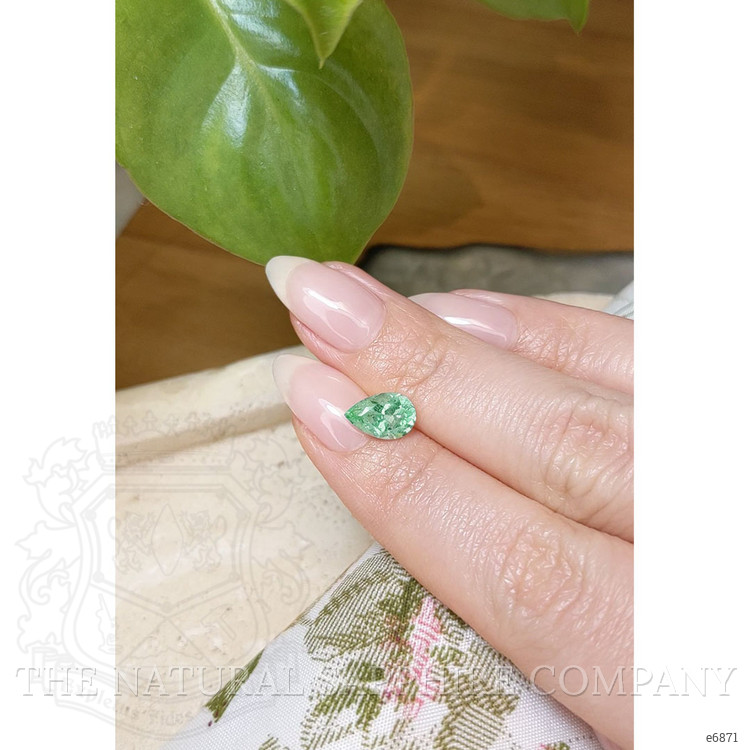 The Natural Emerald Company proudly presents a distinguished gemstone that echoes the elegance of history’s most celebrated jewels. This exquisite 1.39 carat pear-shaped emerald, known for its origin from Russia, boasts dimensions of 9.66 x 6.25 x 4.53 mm. Its unique green hue, characterized by a light color intensity, sets it apart with a delicate vibrancy, reminiscent of the iconic emeralds adored by Cleopatra. This emerald's pear shape and mixed brilliant cut enhance its natural allure, capturing light in a way that creates a mesmerizing display of brilliance.