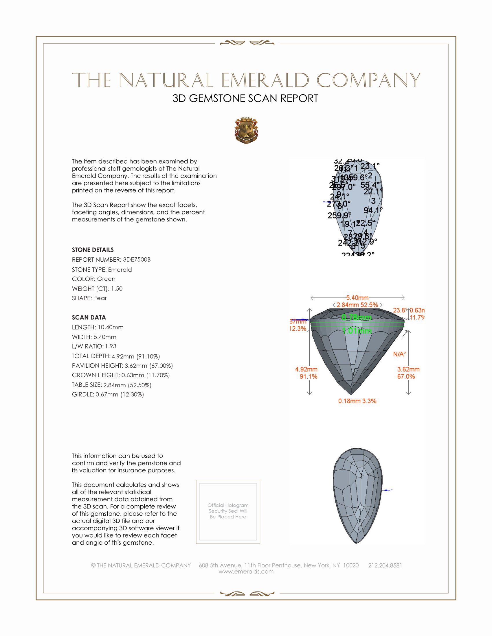 In the heart of Zambia's lush valleys and vibrant landscapes, where verdant foliage dances with the wind and the earth whispers timeless secrets to those who listen, lies the birthplace of an extraordinary gemstone. Forged in nature's own splendor, this 1.50 carat transparent green emerald embarked on a journey through ancient mineral-rich layers of earth, gradually forming over millennia. The journey is a testimony to the resilience and beauty that only nature can masterfully craft. Harvested with precision and care by skilled miners who have dedicated their lives to the truth and purity of the craft, the emerald emerges from the soil, a green jewel of immense potential and captivating allure, its deftly faceted pear shape echoing the vitality of the land it hails from.