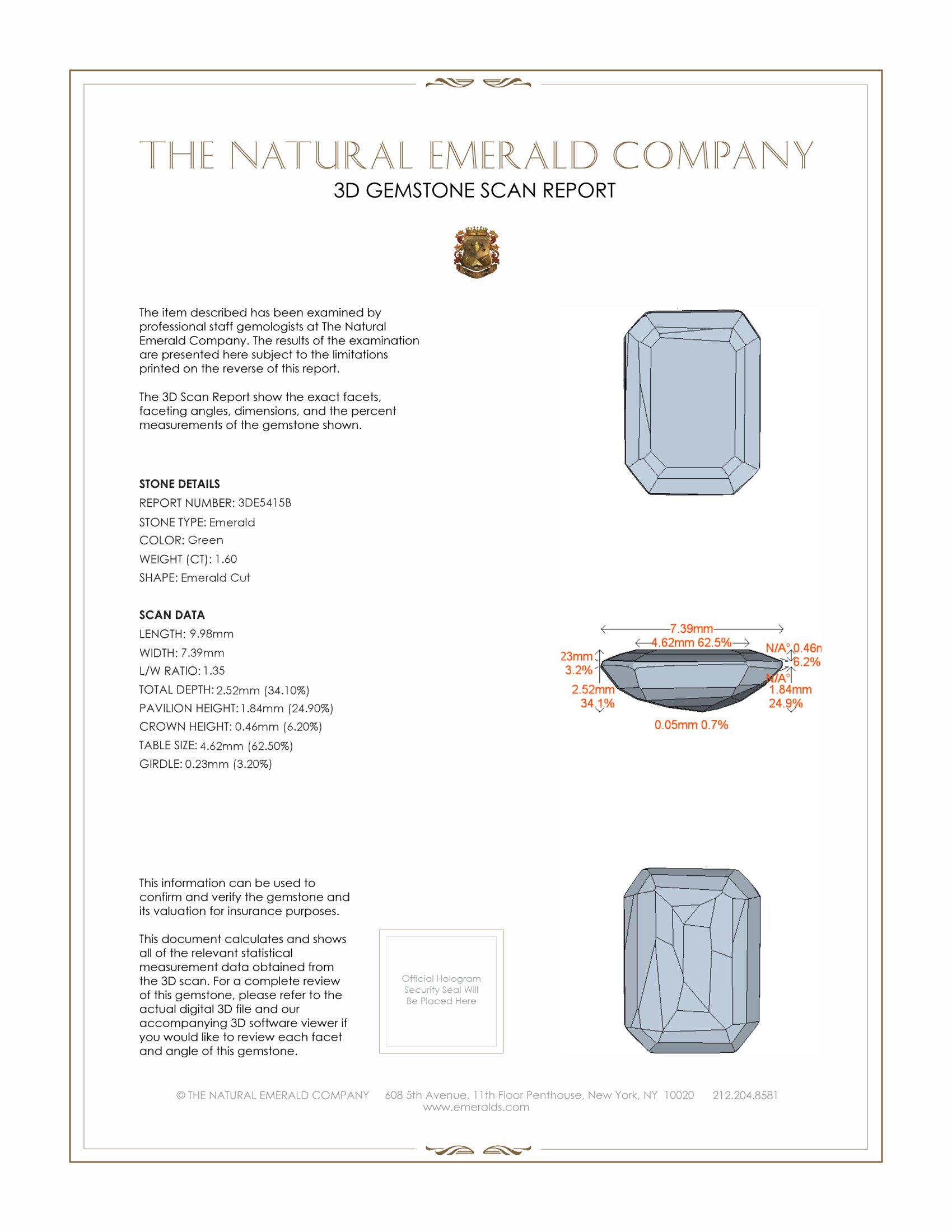 The 1.60 carat emerald offered by The Natural Emerald Company stands as a testament to superior craftsmanship and natural allure. Hailing from Colombia, a region renowned for producing some of the world's most exquisite emeralds, this gemstone boasts an emerald cut that enhances its inherent beauty and brilliance. With precise dimensions of 9.98 x 7.39 x 2.52 mm, its proportions are ideal for those seeking a piece that combines elegance with a remarkable presence. The emerald's hue is a subtle yet captivating green with a medium light color intensity, making it comparable to renowned gemstones from locales such as Zambia and Brazil. However, the depth and iridescence of our Colombian emerald offer a lushness and vibrancy unrivaled in other regions, highlighting the uniqueness of Colombia’s natural resources.