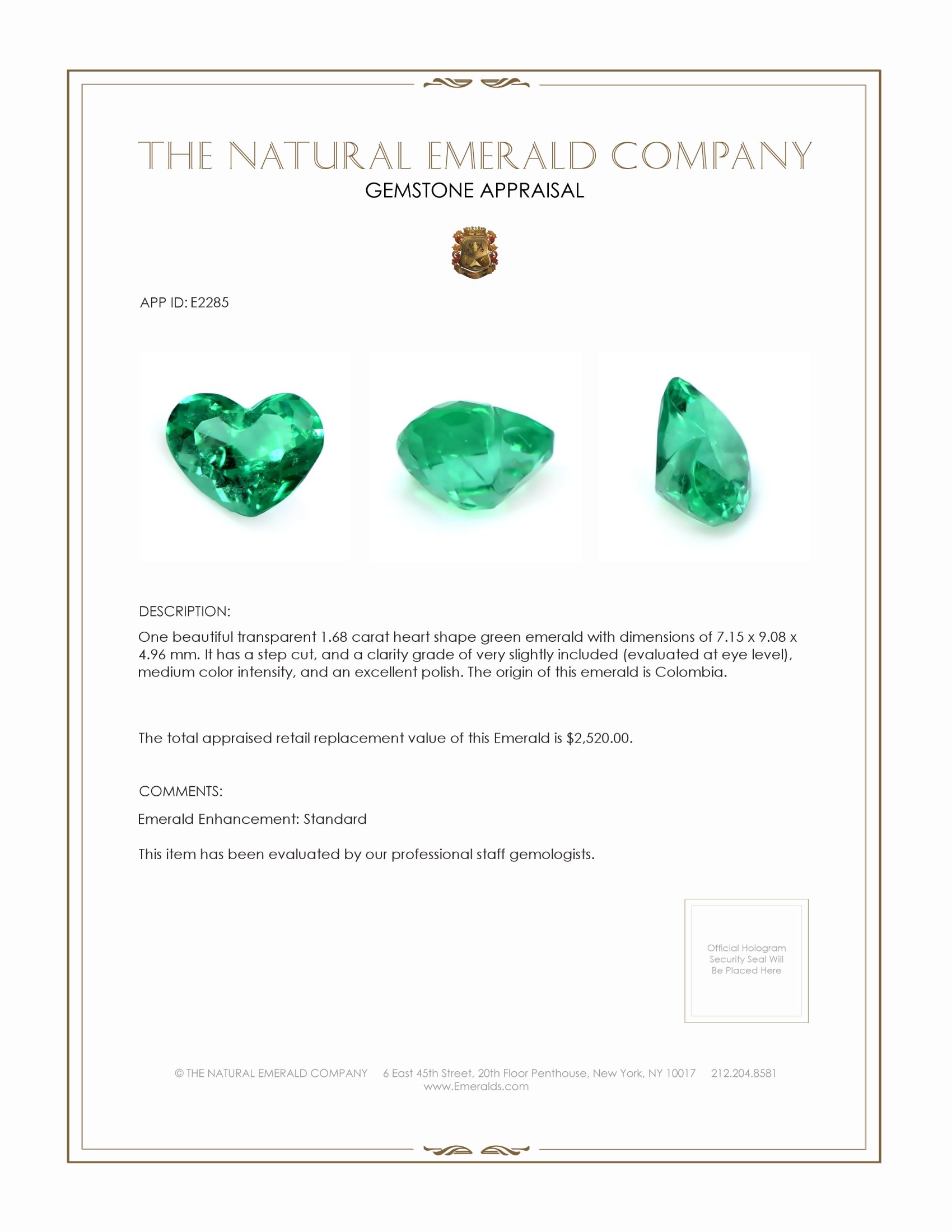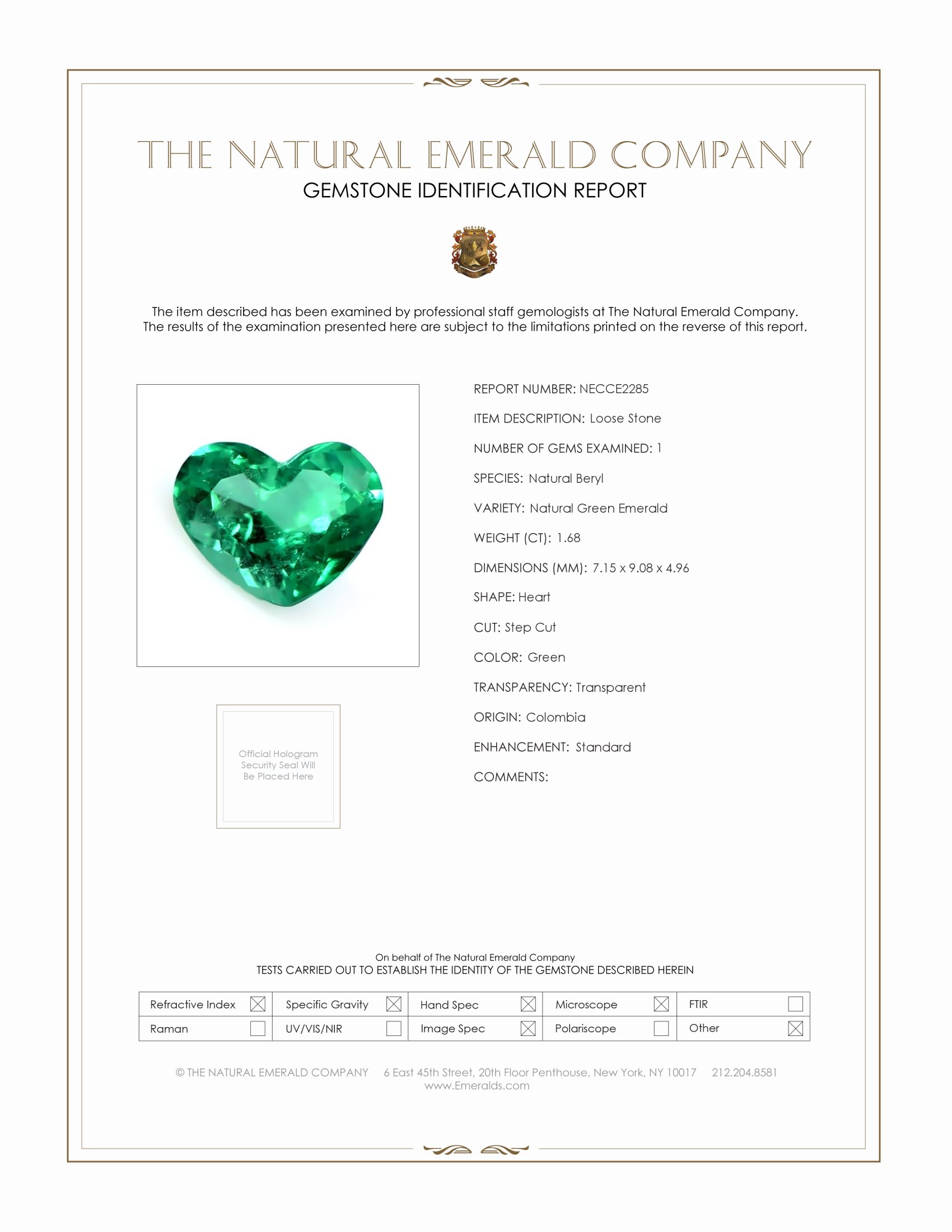 One beautiful transparent 1.68 carat heart shape green emerald with dimensions of 7.15 x 9.08 x 4.96 mm. It has a step cut, and a clarity grade of very slightly included (evaluated at eye level), medium color intensity, and an excellent polish. The origin of this emerald is Colombia.