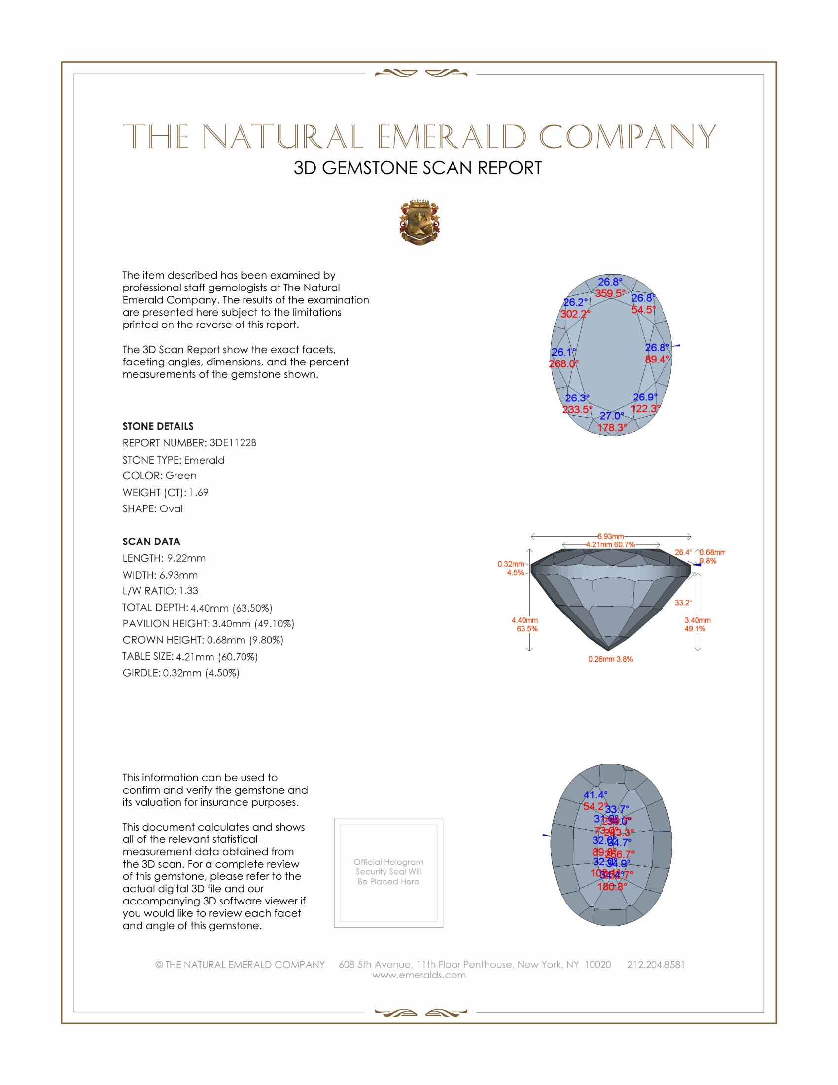 In the world of gemstones, where elegance meets the pinnacle of craftsmanship, there exists an object of unparalleled beauty—an exquisite Zambian emerald that redefines the essence of timeless luxury. Crafted with meticulous precision, this enthralling creation from The Natural Emerald Company is more than just a gemstone; it is a testament to the beauty of nature's grandeur and an ideal choice as an engagement option for those who seek nothing less than perfection. This 1.69 carat transparent oval shape emerald is a true marvel within the revered world of fine jewelry. Its dimensions, 9.22 x 6.93 x 4.40 mm, are expertly designed to capture light from every angle, illuminating a lush green hue that exudes a light, yet enchanting color intensity.